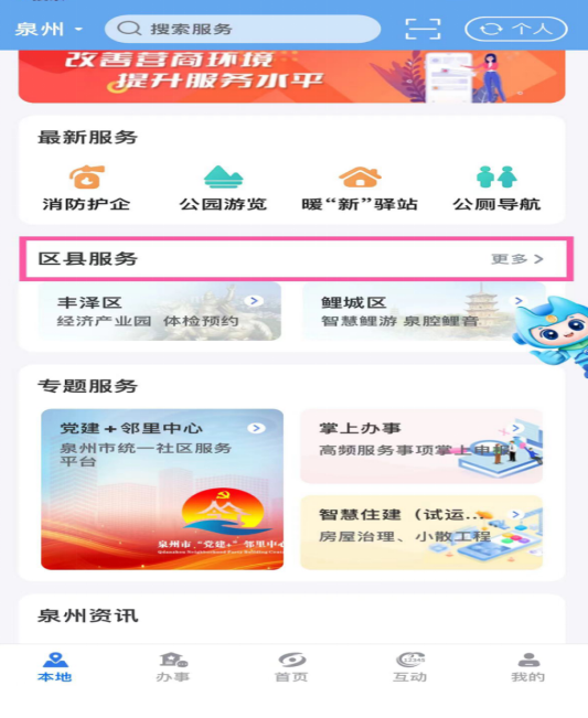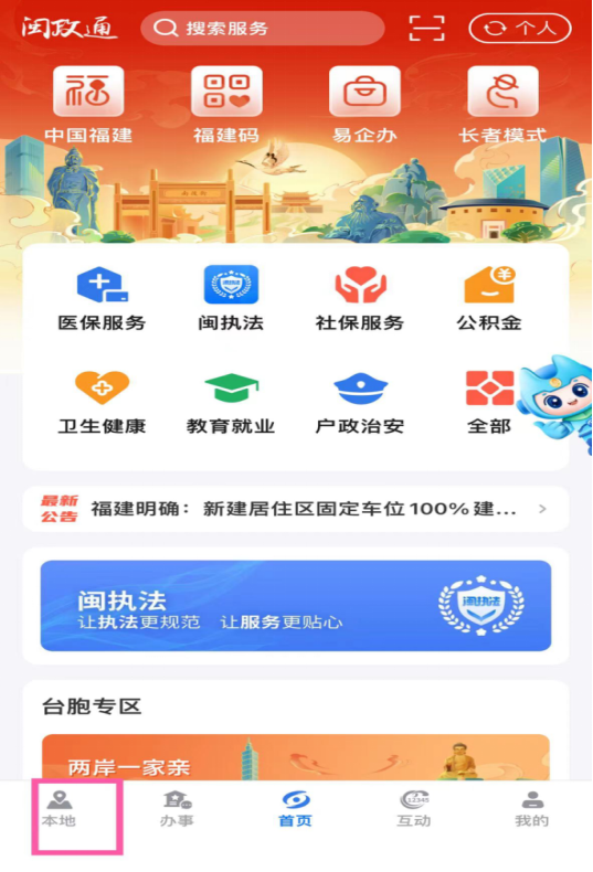 第一步:打开闽政通APP,选择左下角的“本地”。