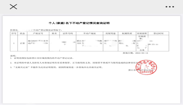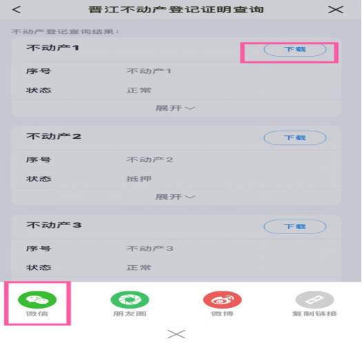第三步:选择“便民服务”中的“个人不动产查询”——选择您所需要的不动产点击“下载”至微信,就得到了您的晋江不动产登记查询证明的pdf文件啦