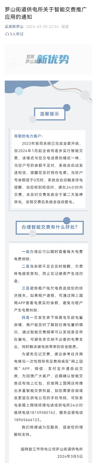 【晋江市罗山街道】罗山供电所关于智能交费推广应用的通知