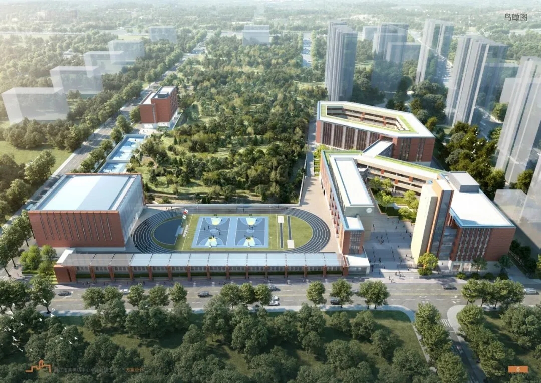 学校建筑以红色为主色调,代表着拼搏向上的文化理念;规划设计因地制宜地把呈“U”字形的校园地块划分为公共功能区、北侧教学区和西南角生活区(教师公寓),主教学区、体育馆和教师公寓之间,穿插布置了各类运动场地。