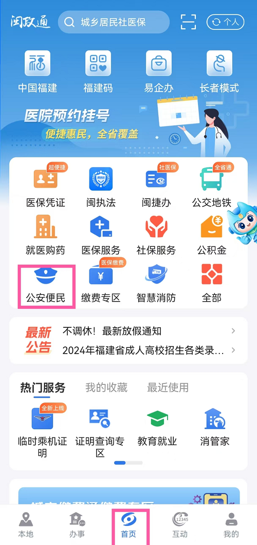 第一步:打开闽政通APP,点击“首页”的“公安便民”进入。
