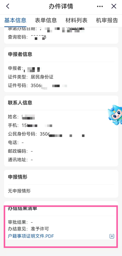第五步:从首页“我的”——“我的办件”查询您的办件记录,当您的办件状态显示“办结”,即可点击进入拉到页面最底部查看办结结果清单。