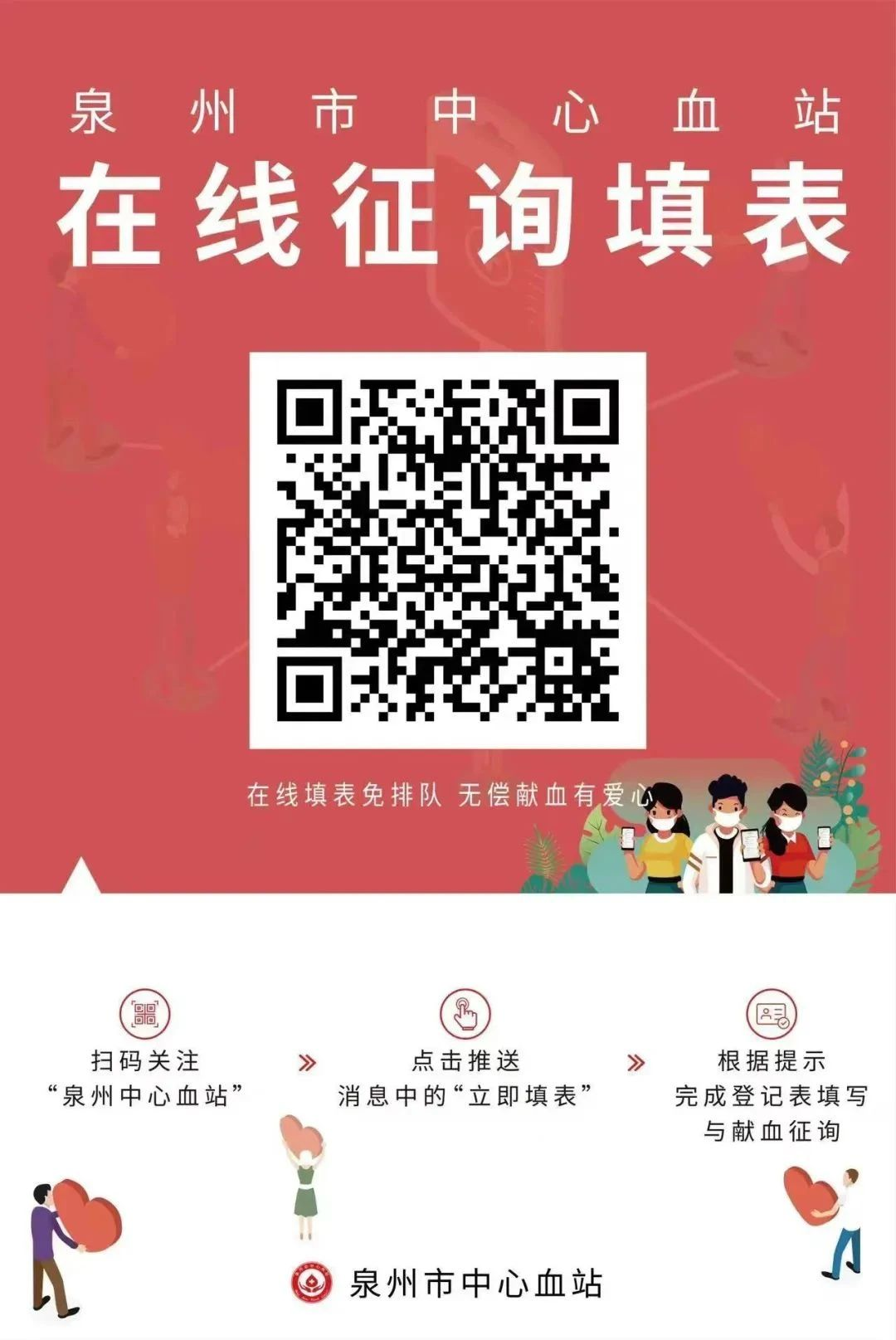 1.手机微信扫码关注“泉州市中心血站”→点击“去献血”→“在线填表”→根据提示完成在线征询填表。