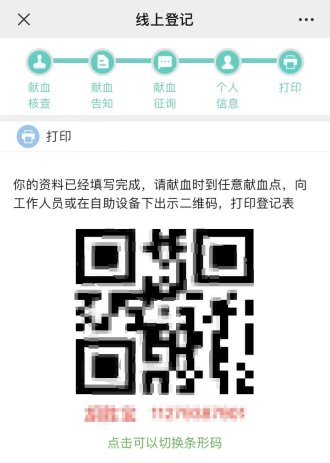 2. 填表完成后生成二维码(二维码可截图保存3天)。到现场后将二维码出示给工作人员打印献血登记表。