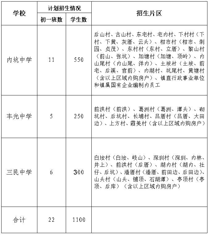 内坑镇初中学校招生计划及片区划分