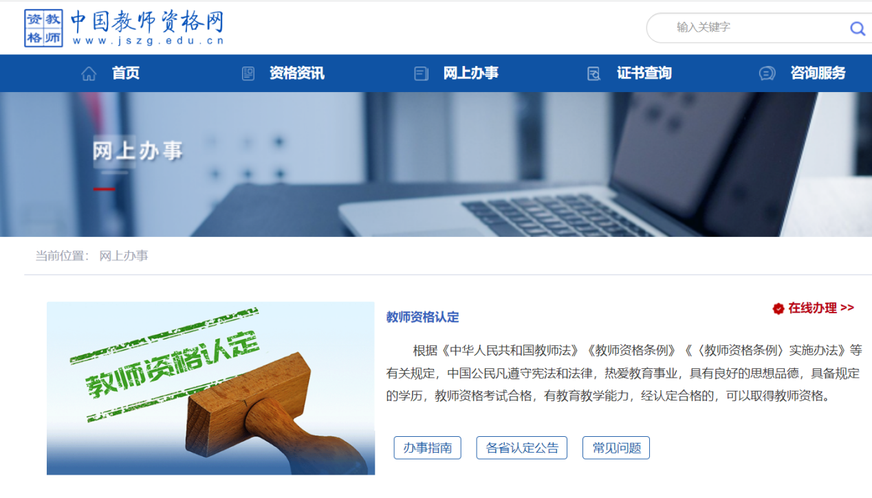 - 点击首页 “网上办事”栏目下“教师资格认定”服务入口