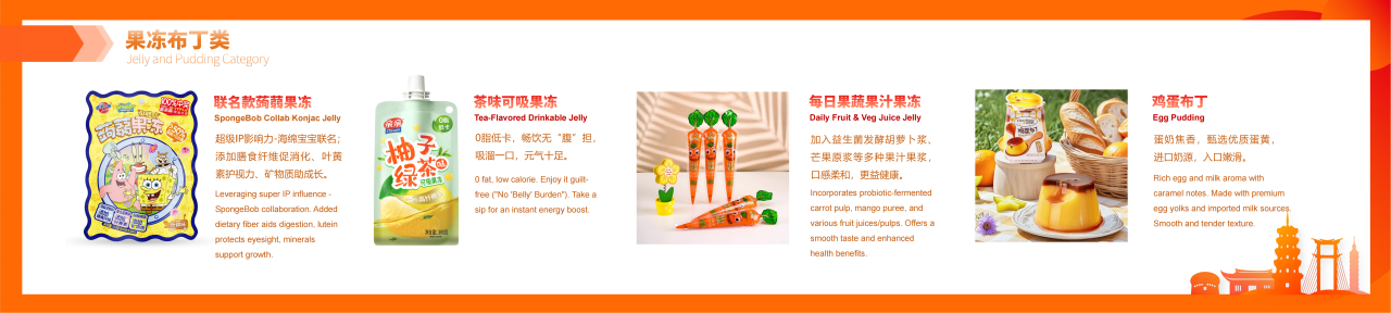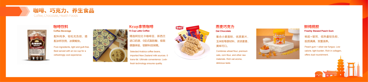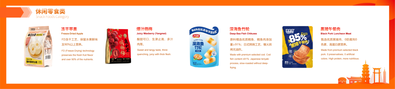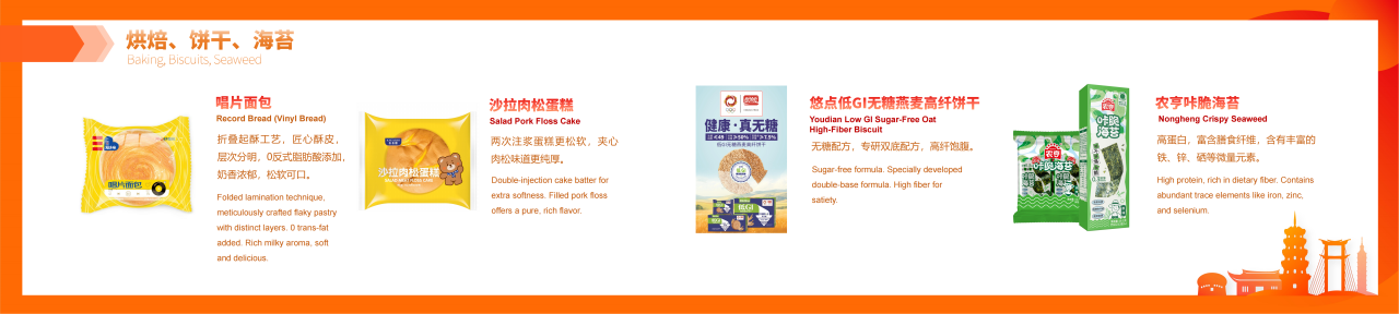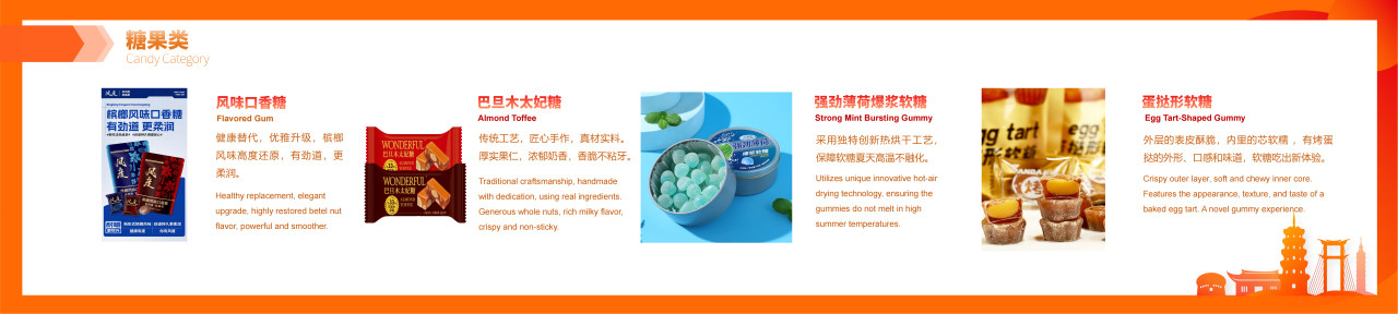 紧扣全球休闲食品制造上下游产业链,汇聚休闲食品成品、新零售、食品加工包装机械、食品工艺技术、食品原辅材料及添加剂、品牌授权及包装设计6大领域;设置5个主题馆及食品科技创新成果展示区、军创企业产品区、区域品牌馆(包括台湾馆、晋江老字号馆、南昌馆、温县馆、安岳馆等)等特色展区;上好佳、雅客、久久王、泡吧、友臣、力诚、好丽友、马大姐、俄罗斯紫皮糖、菲律宾水果冻干、香港手信曲奇、雀巢巧克力、台湾牛轧糖、芦荟露等全球优质品牌、好物集中展示。