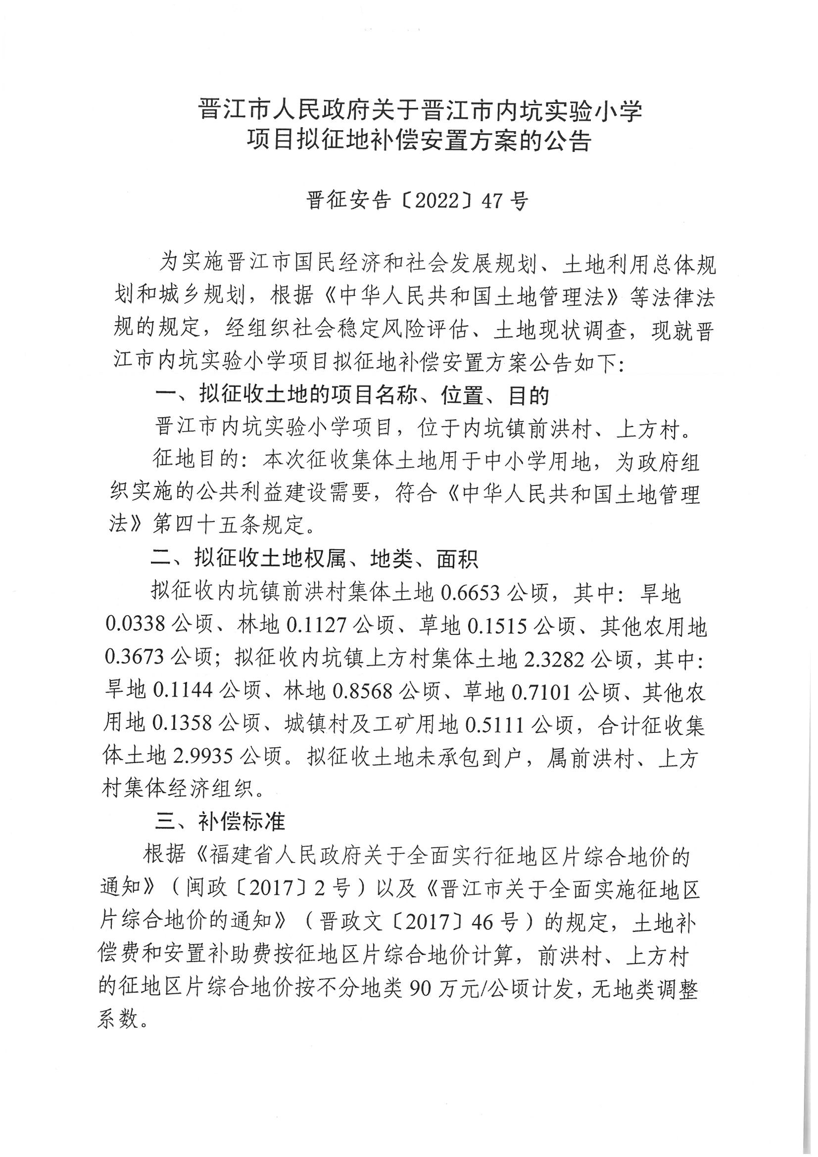 (晋征安告〔2022〕47号)晋江市人民政府关于晋江市内坑实验小学项目拟征地补偿安置方案的公告_页面_1