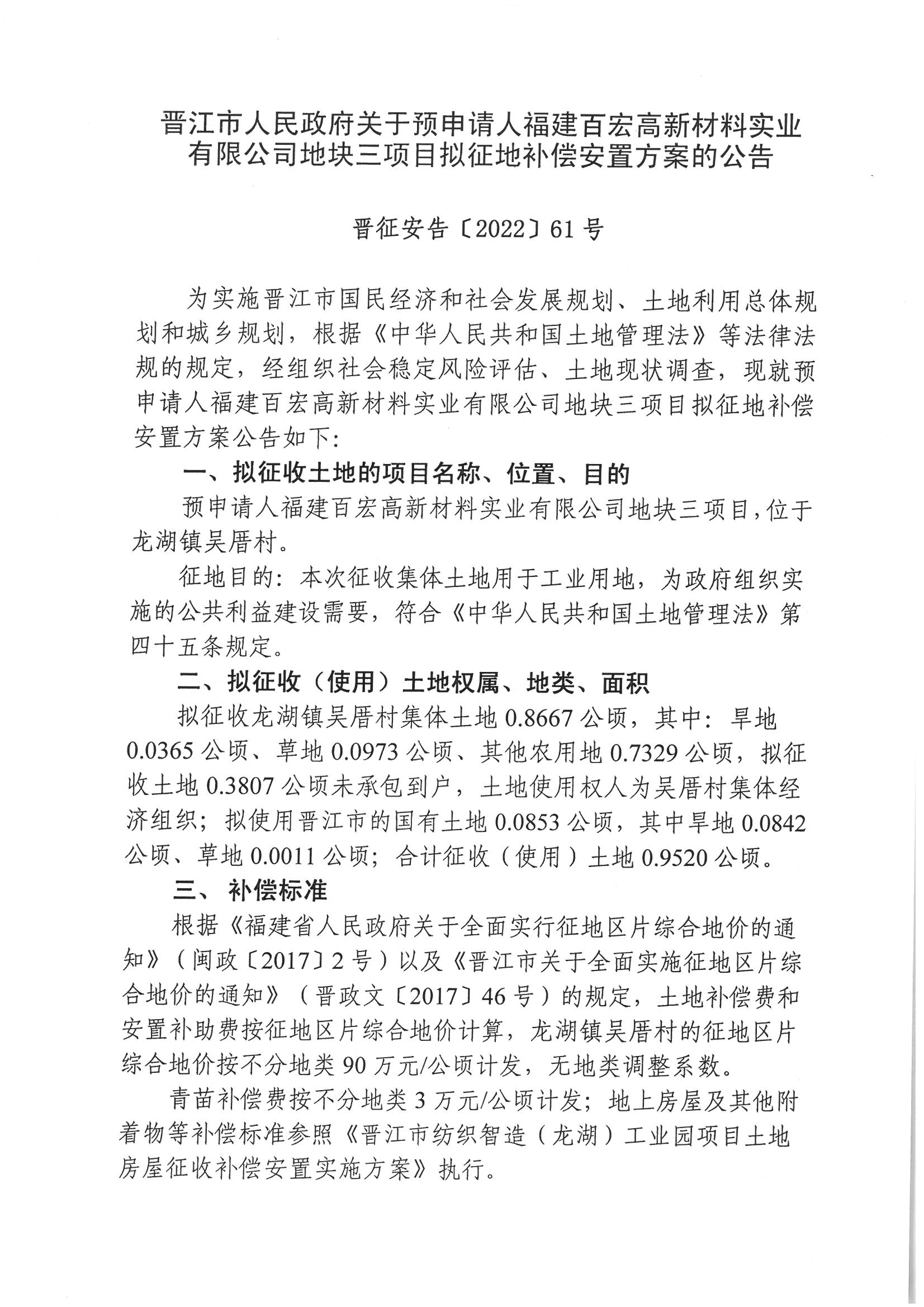 (晋征安告〔2022〕61号)晋江市人民政府关于预申请人福建百宏高新材料实业有限公司地块三项目拟征地补偿安置方案的公告_页面_1