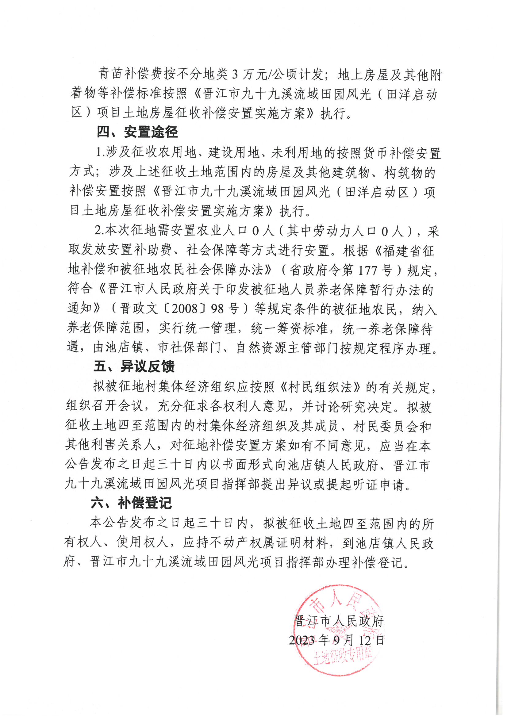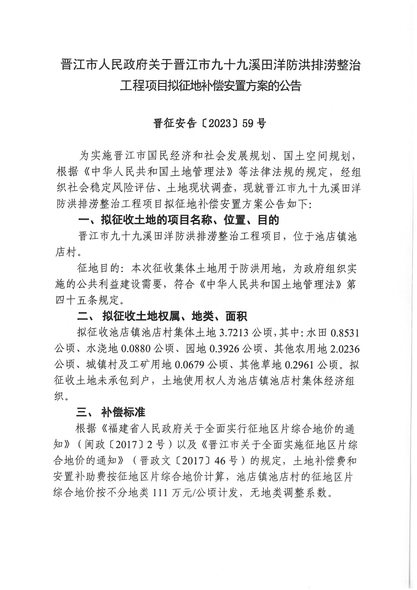 晋江市人民政府关于晋江市九十九溪田洋防洪排涝整治工程项目拟征地补偿安置方案的公告