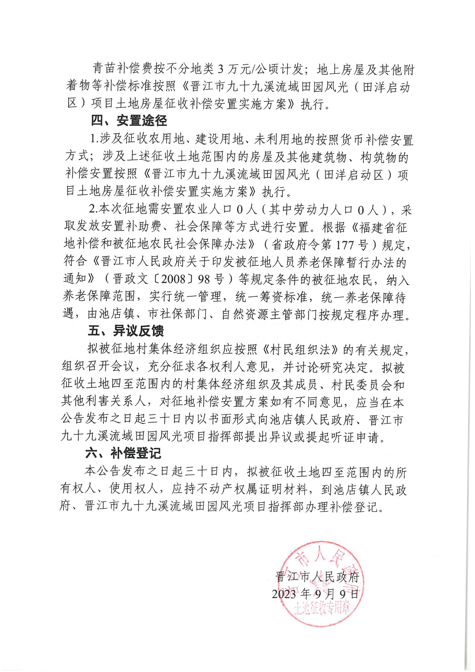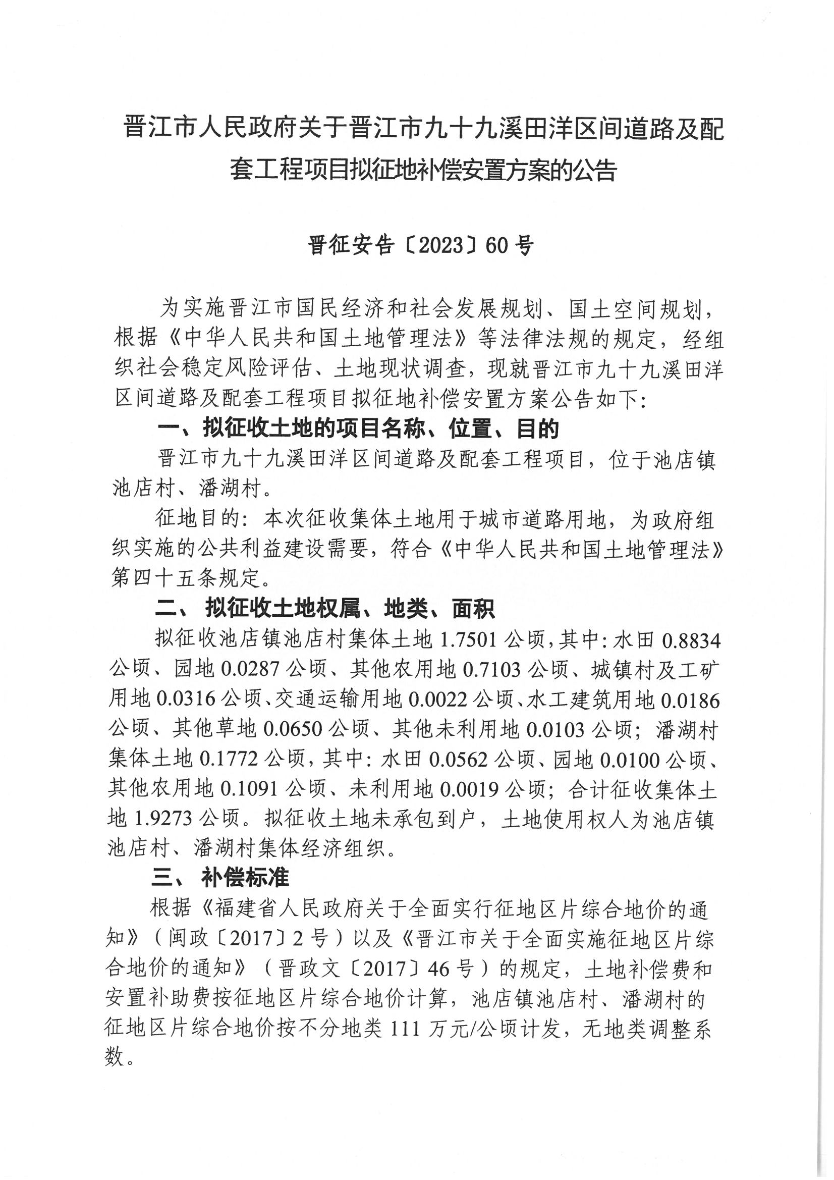 晋江市人民政府关于晋江市九十九溪田洋区间道路及配套工程项目拟征地补偿安置方案的公告