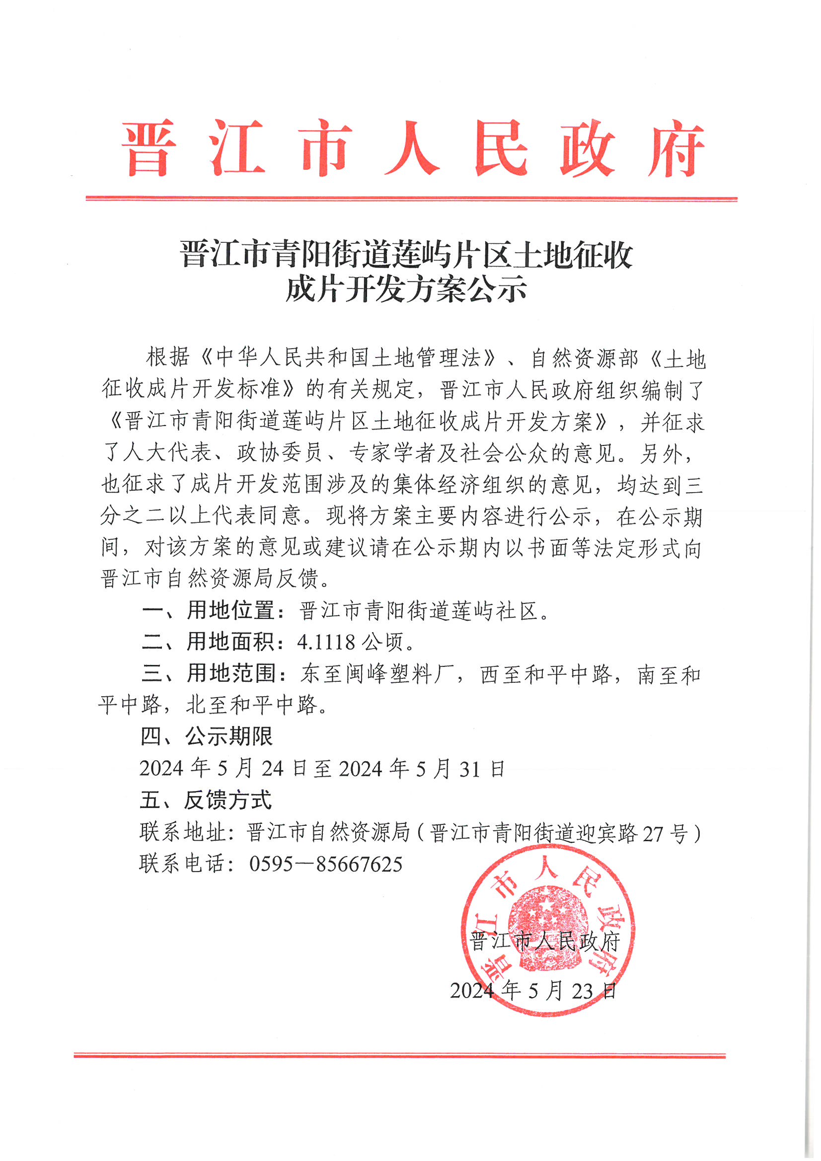 晋江市青阳街道莲屿片区土地征收成片开发方案公示