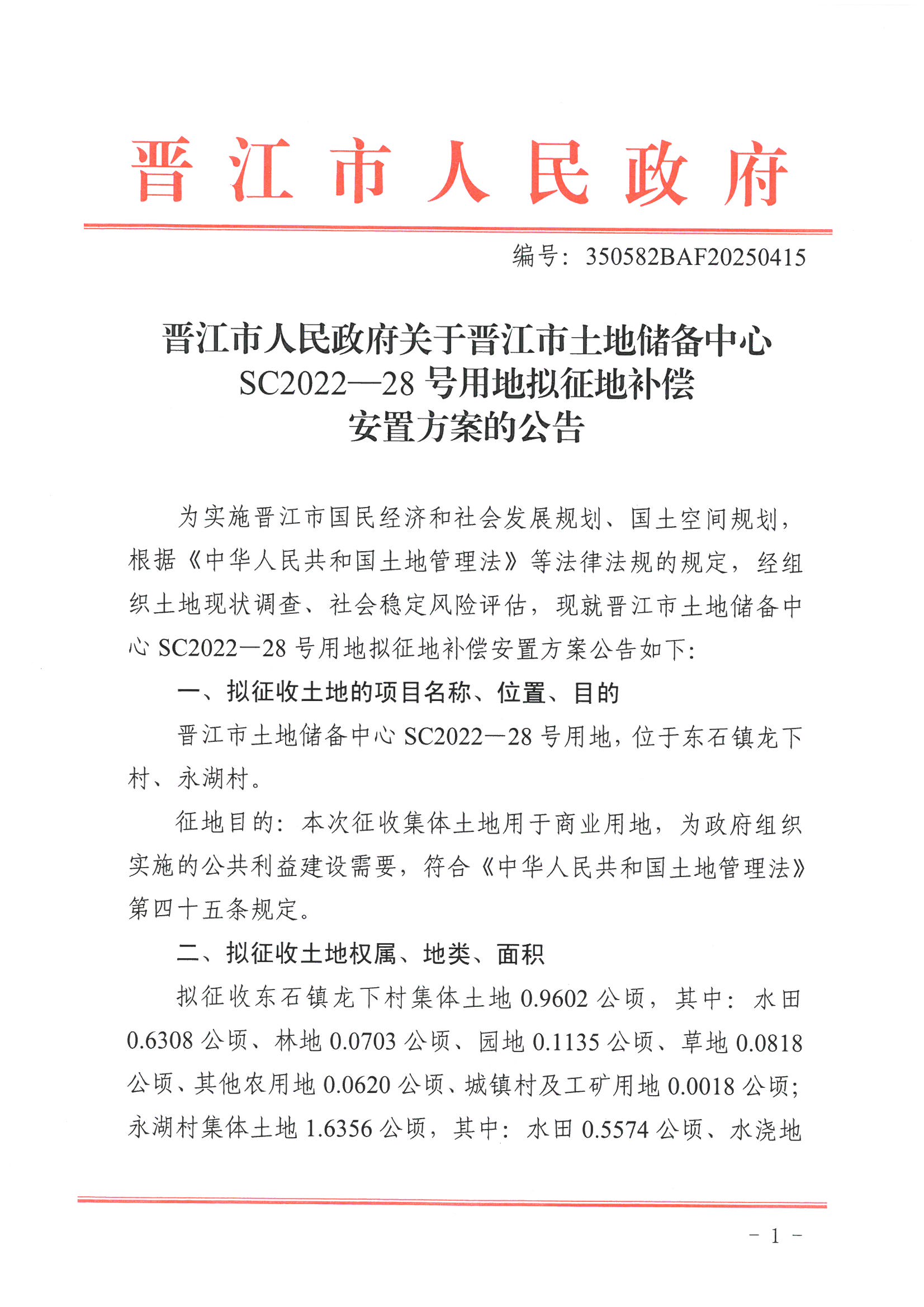 晋江市人民政府关于晋江市土地储备中心SC2022一28号用地拟征地补偿安置方案公告