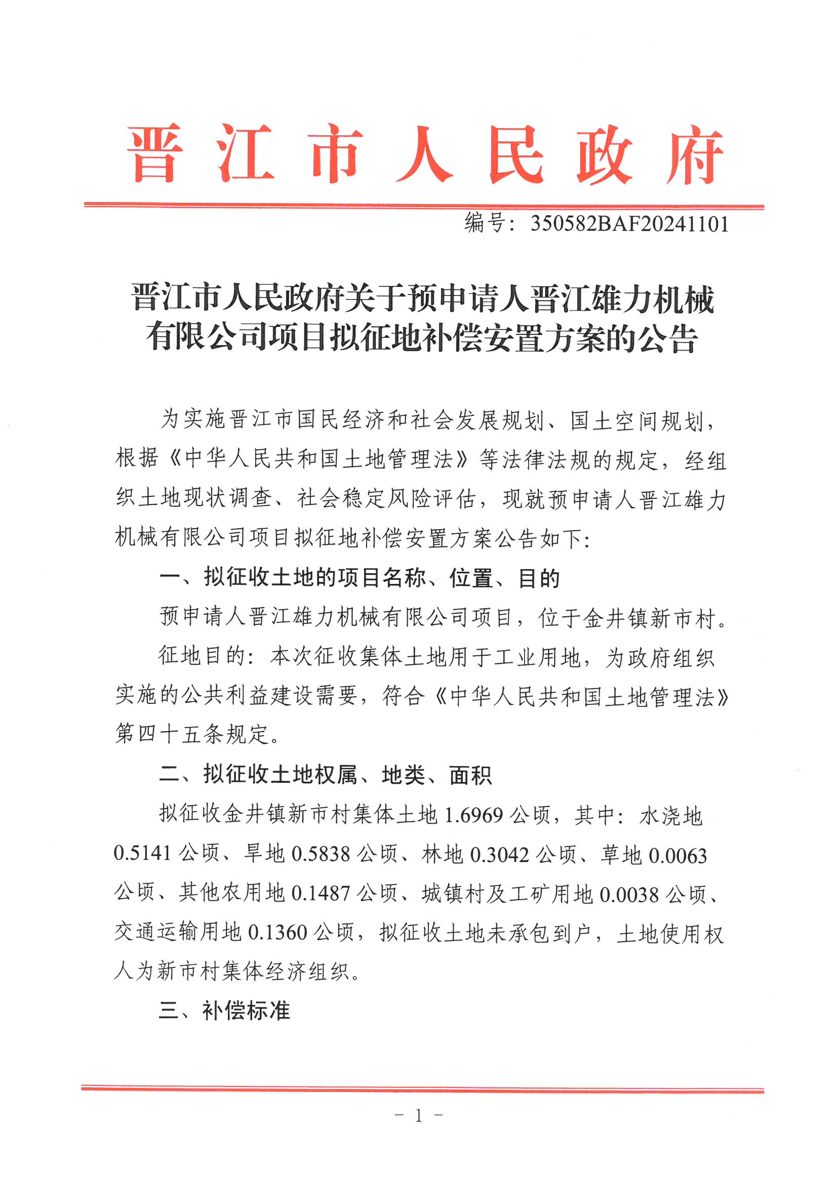 晋江市人民政府关于预申请人晋江雄力机械有限公司项目拟征地补偿安置方案的公告