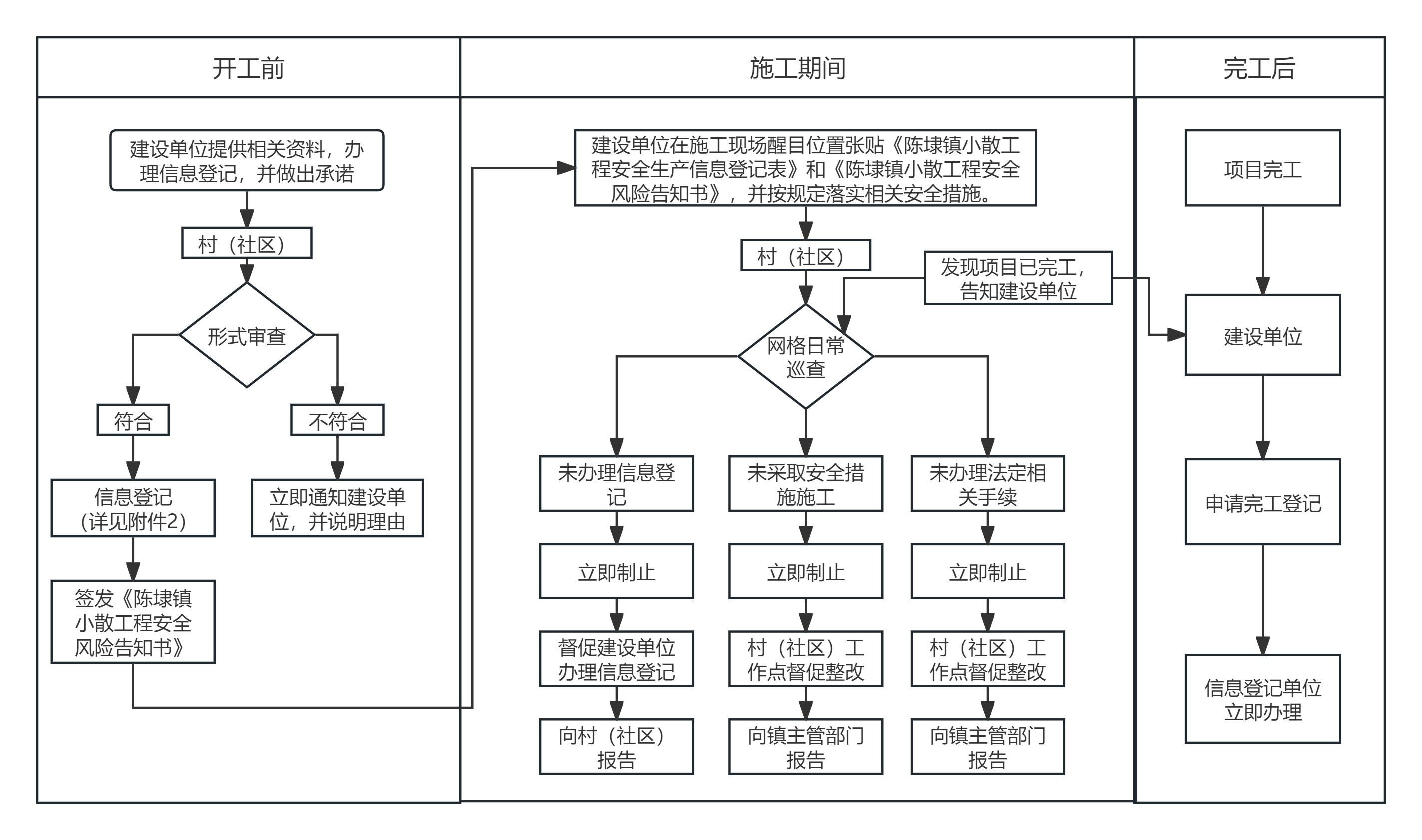 (2)完善辖区小散工程安全生产管理机制,建立“信息登记服务、安全提醒告知、日常安全巡查、隐患排查治理”等链条清晰、分工明确的工作流程;