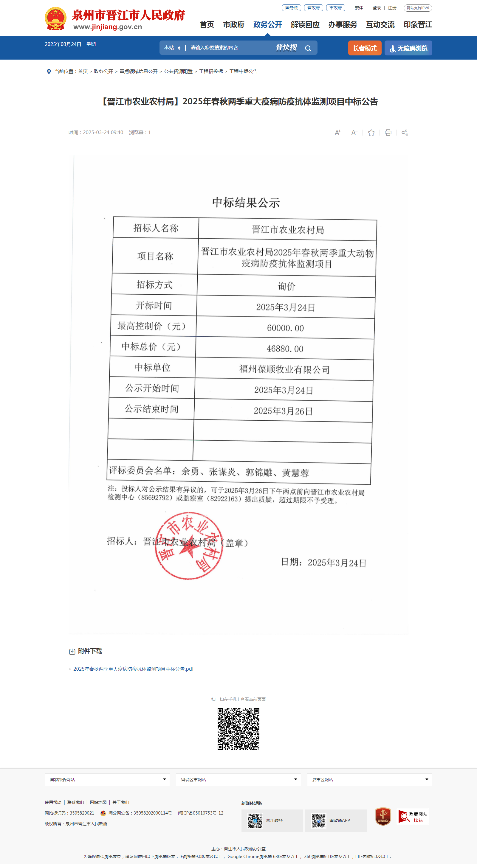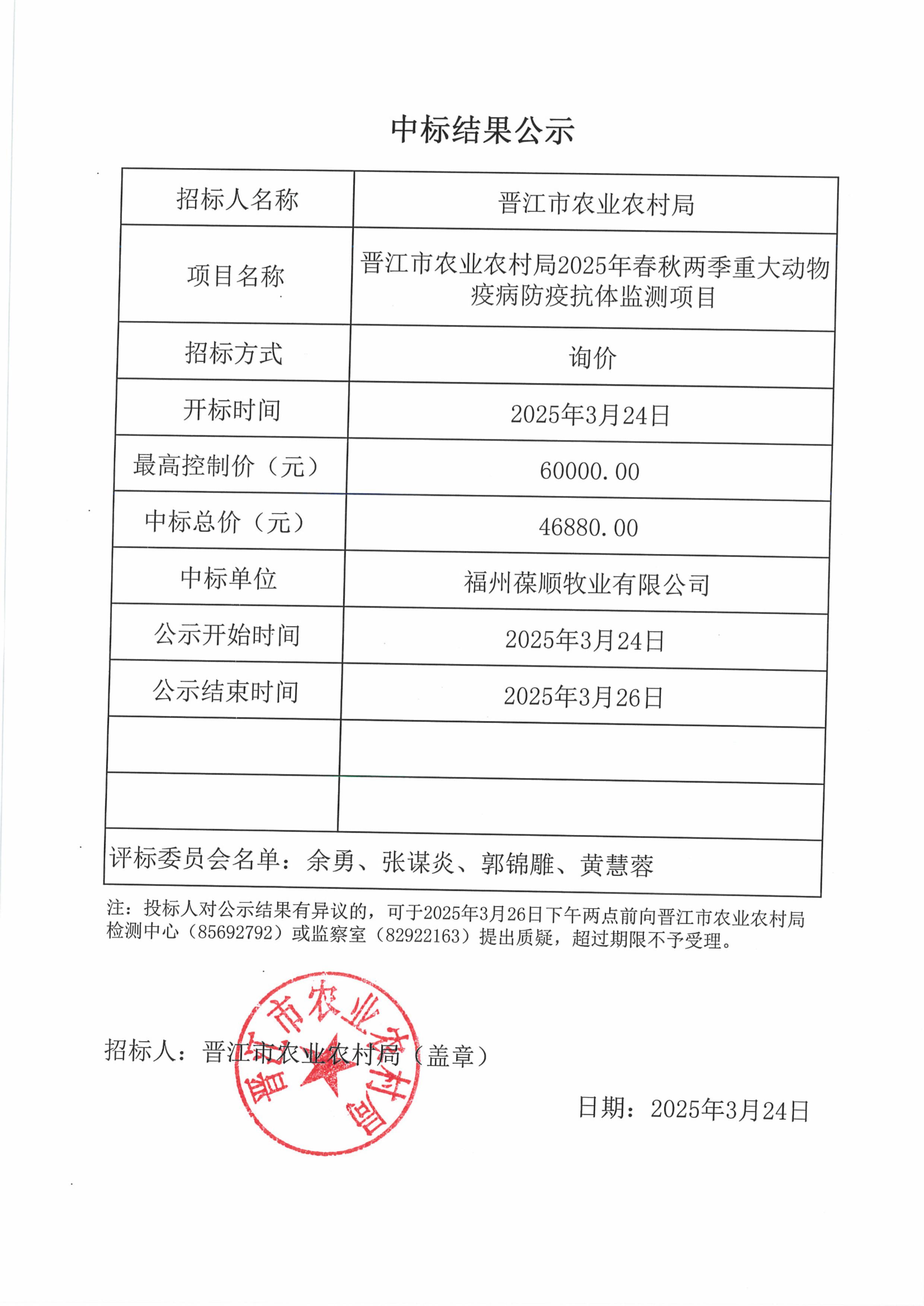 【晋江市农业农村局】2025年春秋两季重大动物疫病防疫抗体监测项目中标公告