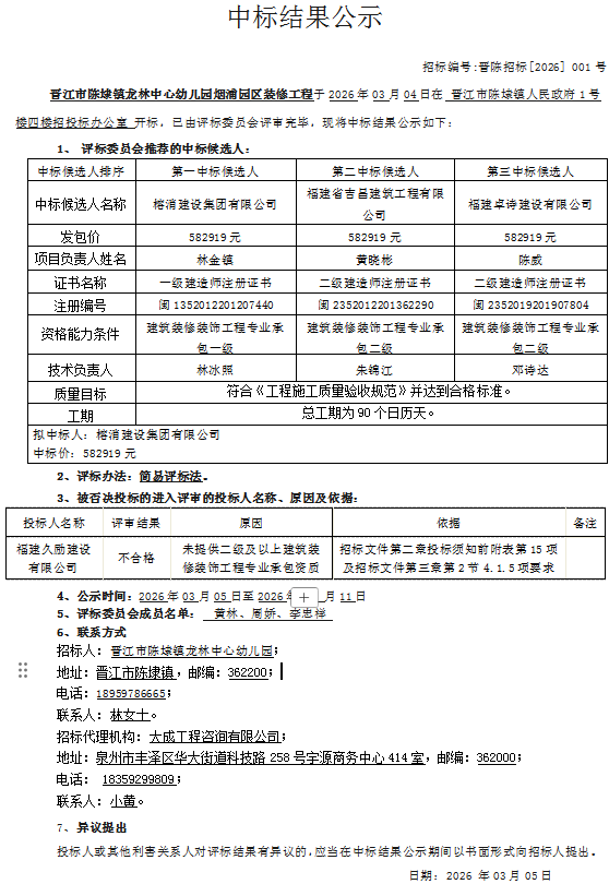 【晋江市陈埭镇人民政府】晋江市陈埭镇龙林中心幼儿园烟浦园区装修工程中标结果公示