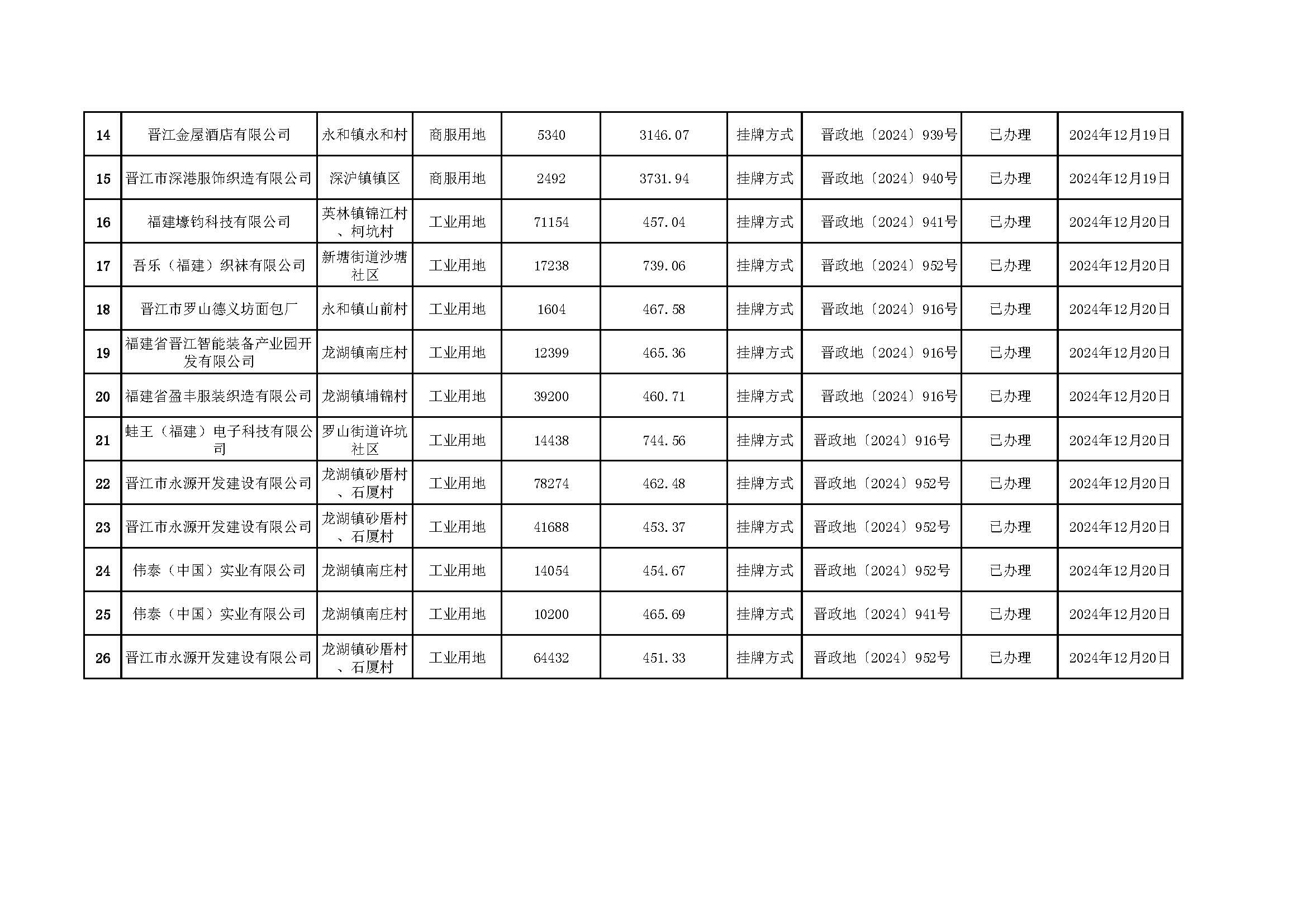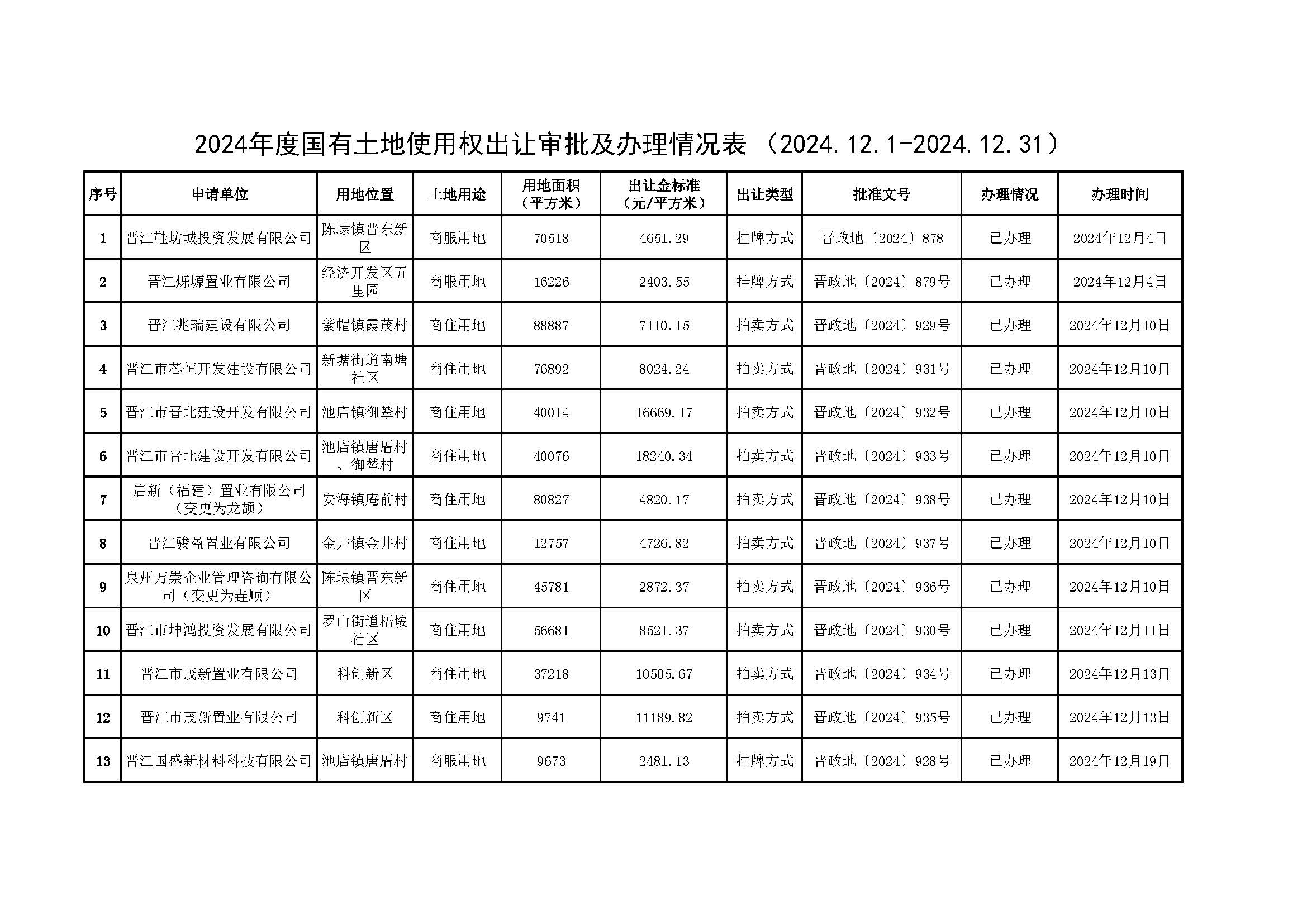 2024年度国有土地使用权出让审批及办理情况表(2024.12.1-2024.12.31)