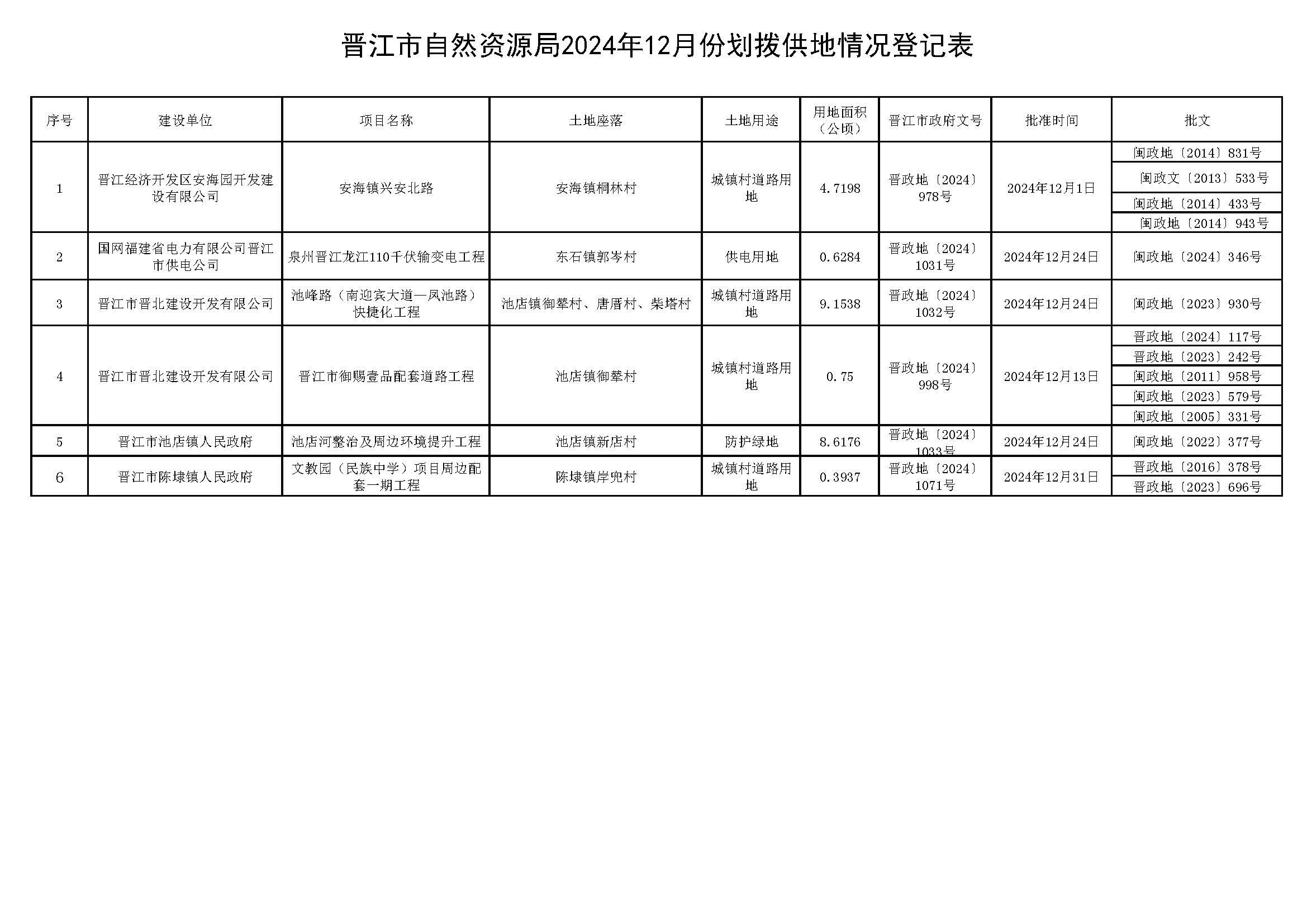 晋江市自然资源局2024年12月份划拨供地情况登记表