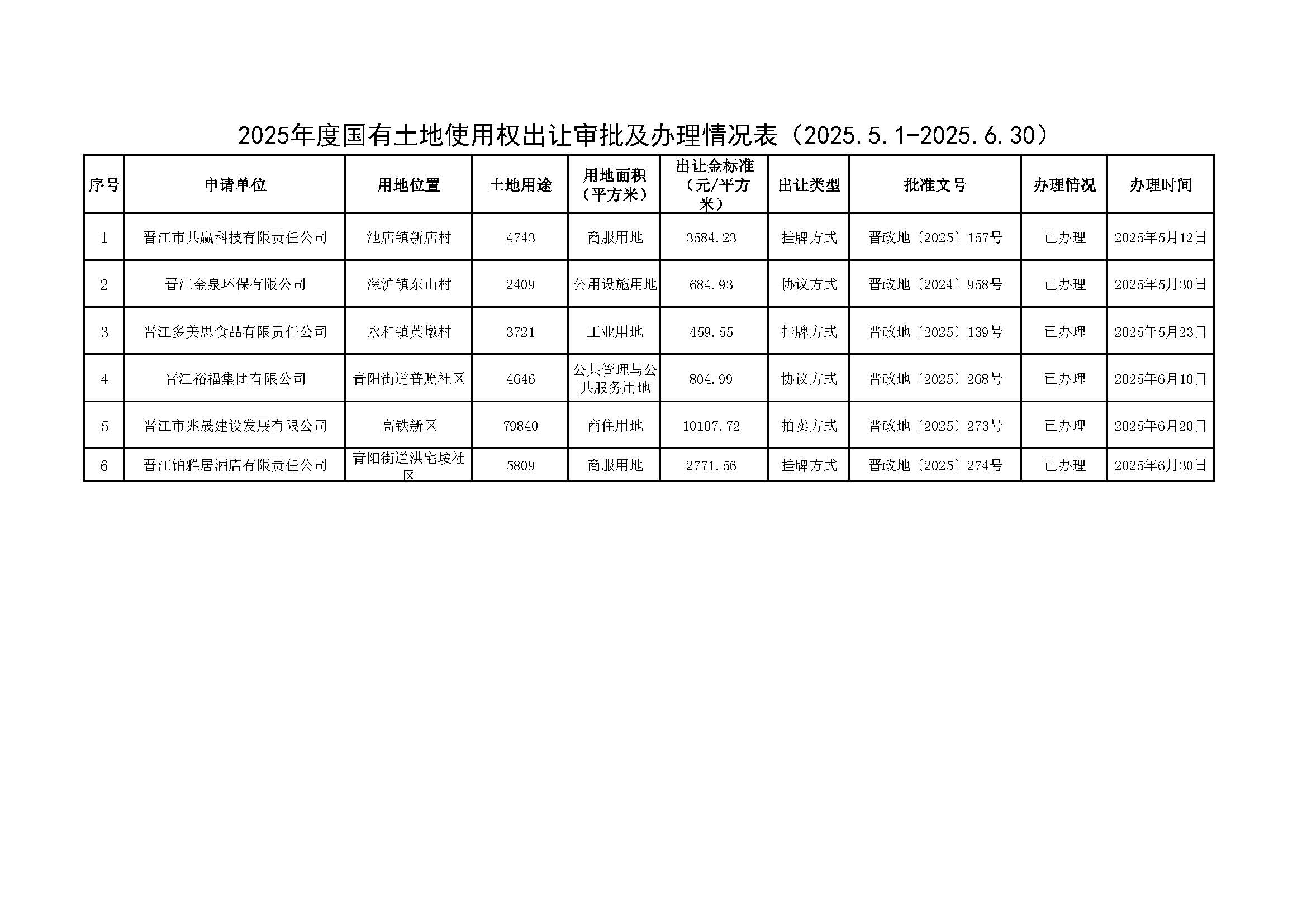 2025年度国有土地使用权出让审批及办理情况表(2025.5.1-2025.6.30)