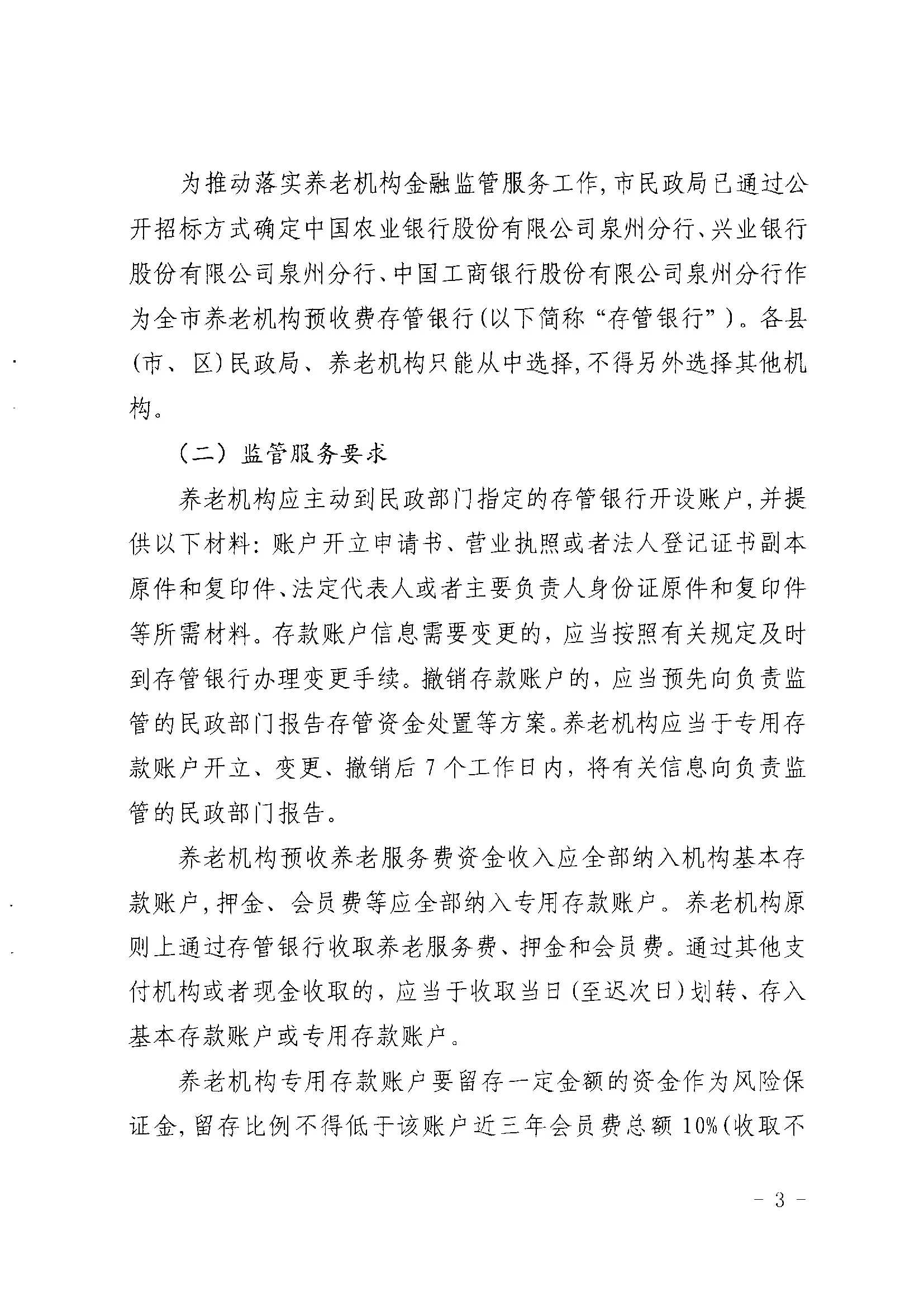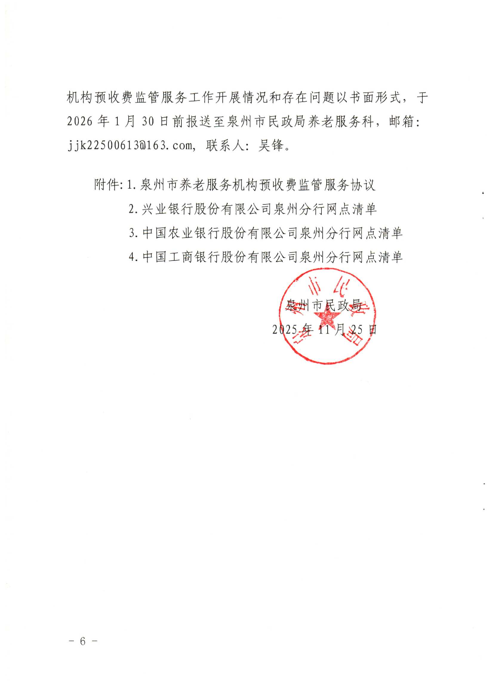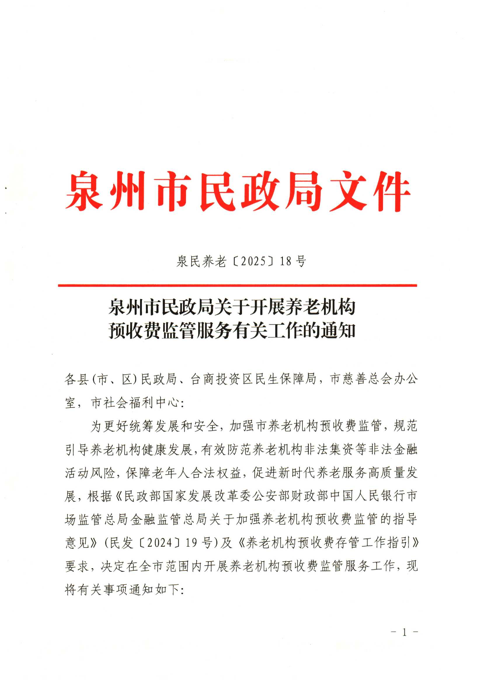 为防范非法集资等金融风险,规范养老机构预收费行为,保障老年人合法权益,推动养老服务高质量发展。现将《泉州市民政局关于开展养老机构预收费监管服务有关工作的通知》(泉民养老〔2025〕18号)转发给你们,并做以下强调,请遵照执行。