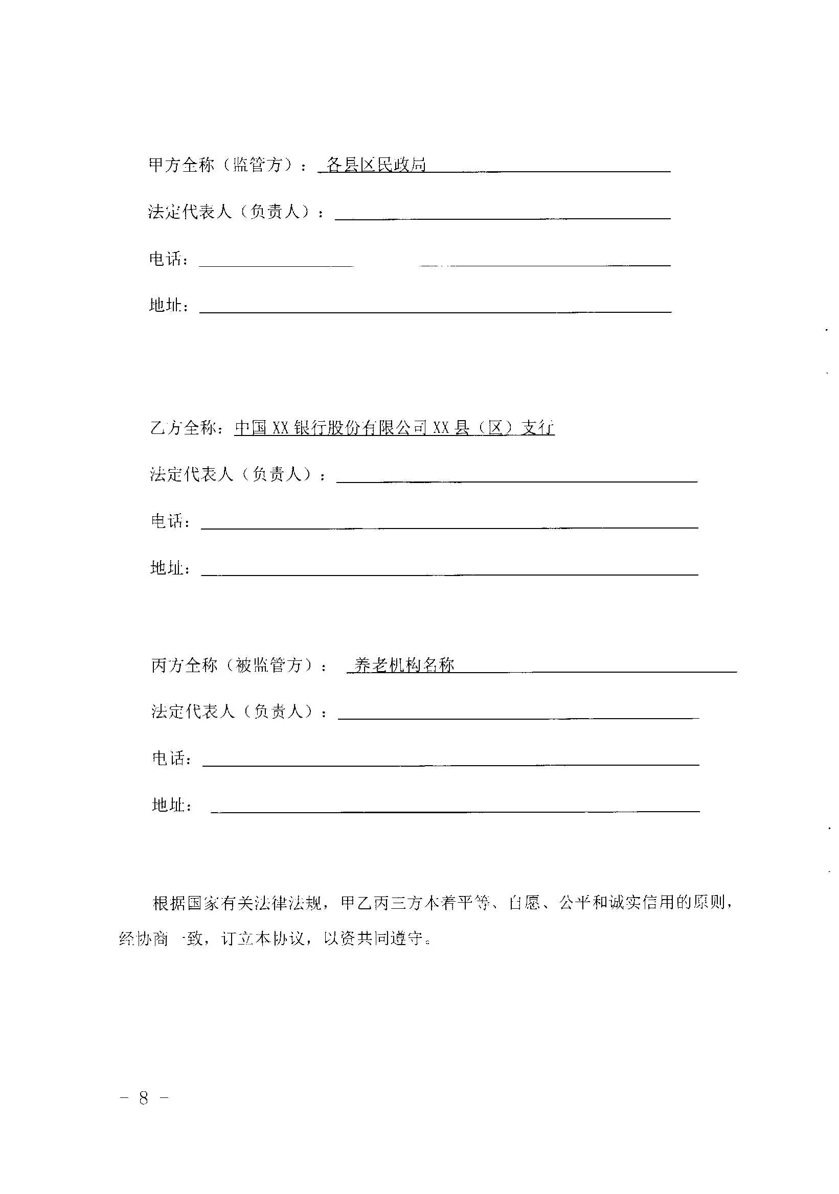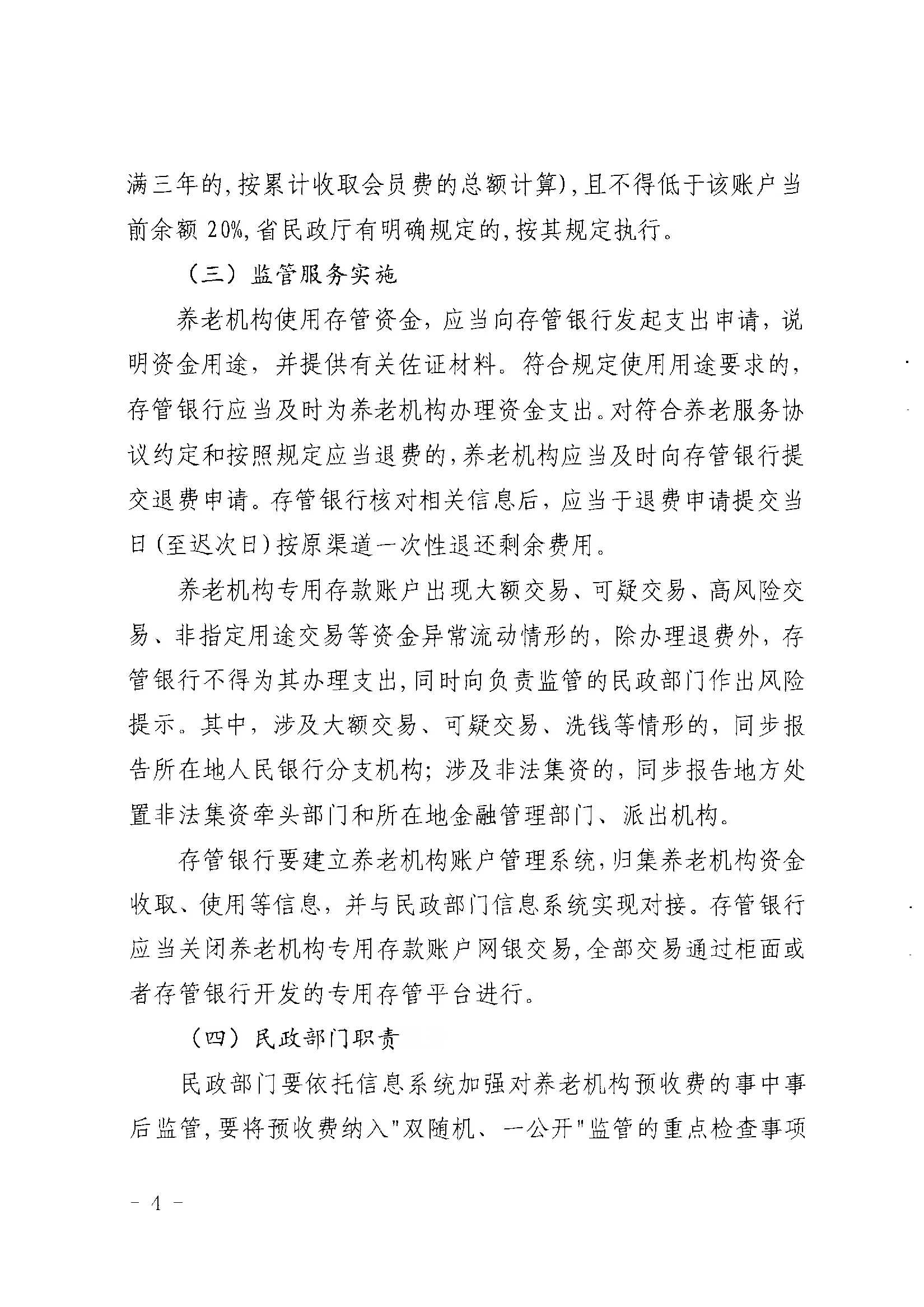 各养老服务机构应在2月28日前选择存管银行,并与其签订预收费监管服务协议;各镇(街道)社会事务办要切实履行属地管理责任,督促辖区内所有养老服务机构严格按照本通知要求,在规定时限内完成存管银行选择及预收费监管服务协议签订工作,并于3月2日前将养老机构预收费签约情况上报市民政局养老科;同时做好日常监管工作,定期排查辖区内养老机构预收费行为,及时发现并督促整改苗头性、倾向性问题,全力防范预收费相关风险,保障老年人合法权益。