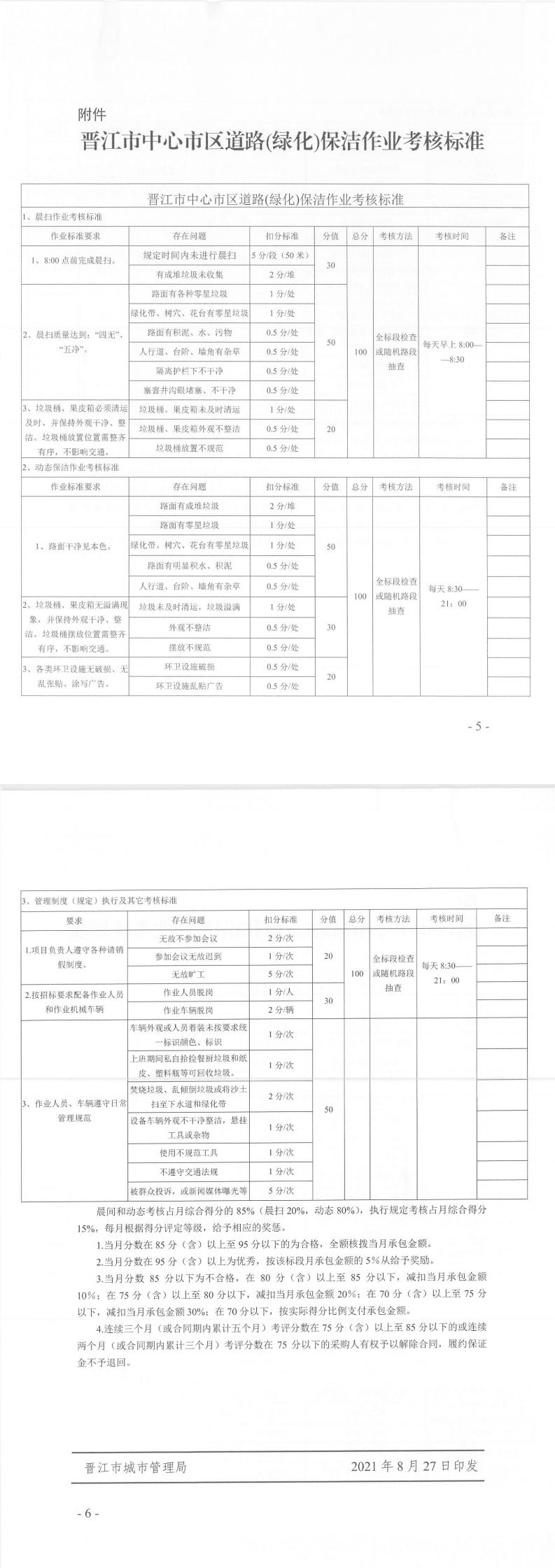 (三)作业标准。各业主单位参照《晋江市中心市区道路(绿化)保洁作业标准》和《晋江市村(社区)环境卫生检查考评标准》设定招标文件。