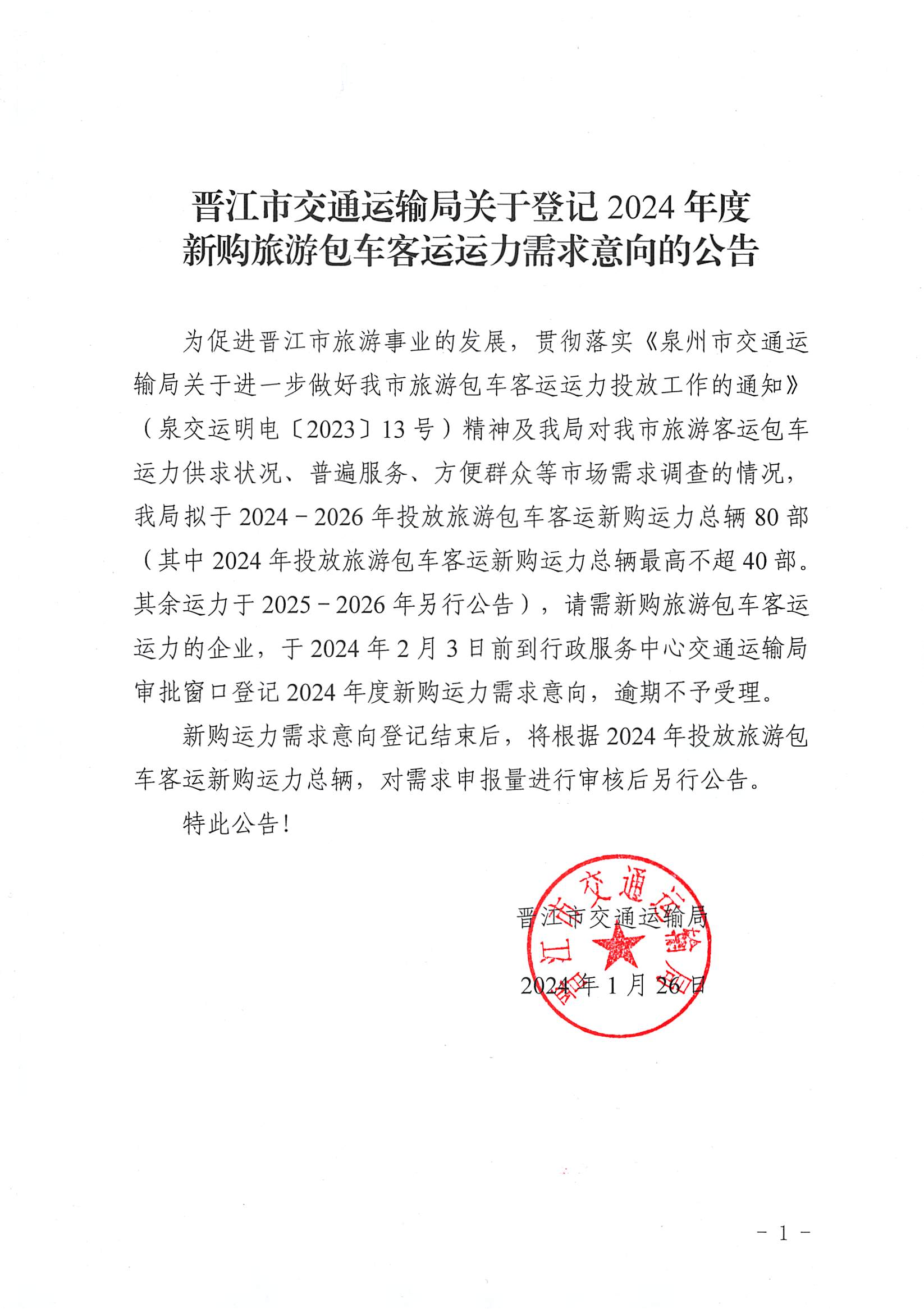 晋江市交通运输局关于登记2024年度新购旅游包车客运运力需求意向的公告