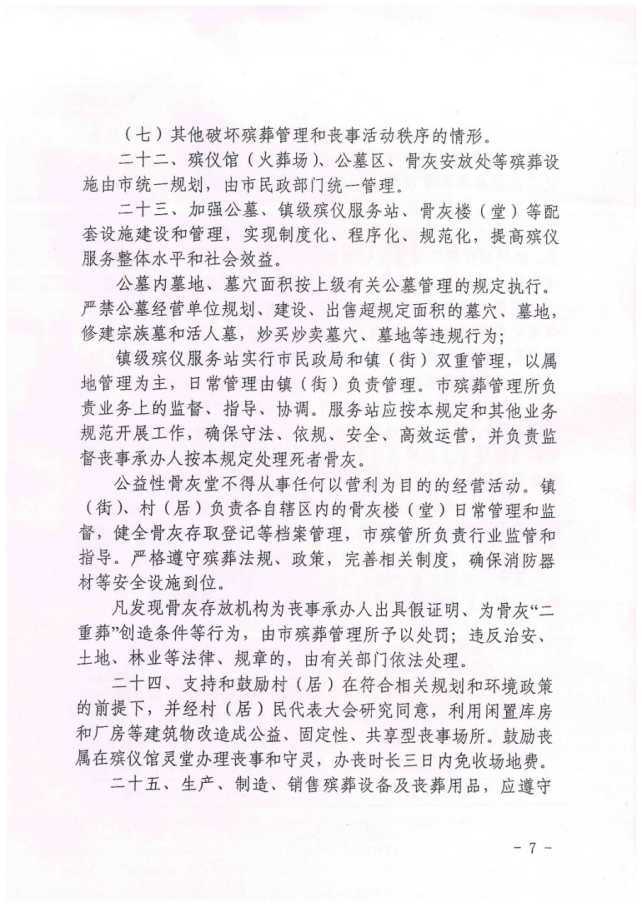(七)殡仪服务不得妨碍公共秩序、危害公共安全,不得侵害他人的合法权益,不得从事封建迷信或违背社会公德活动。