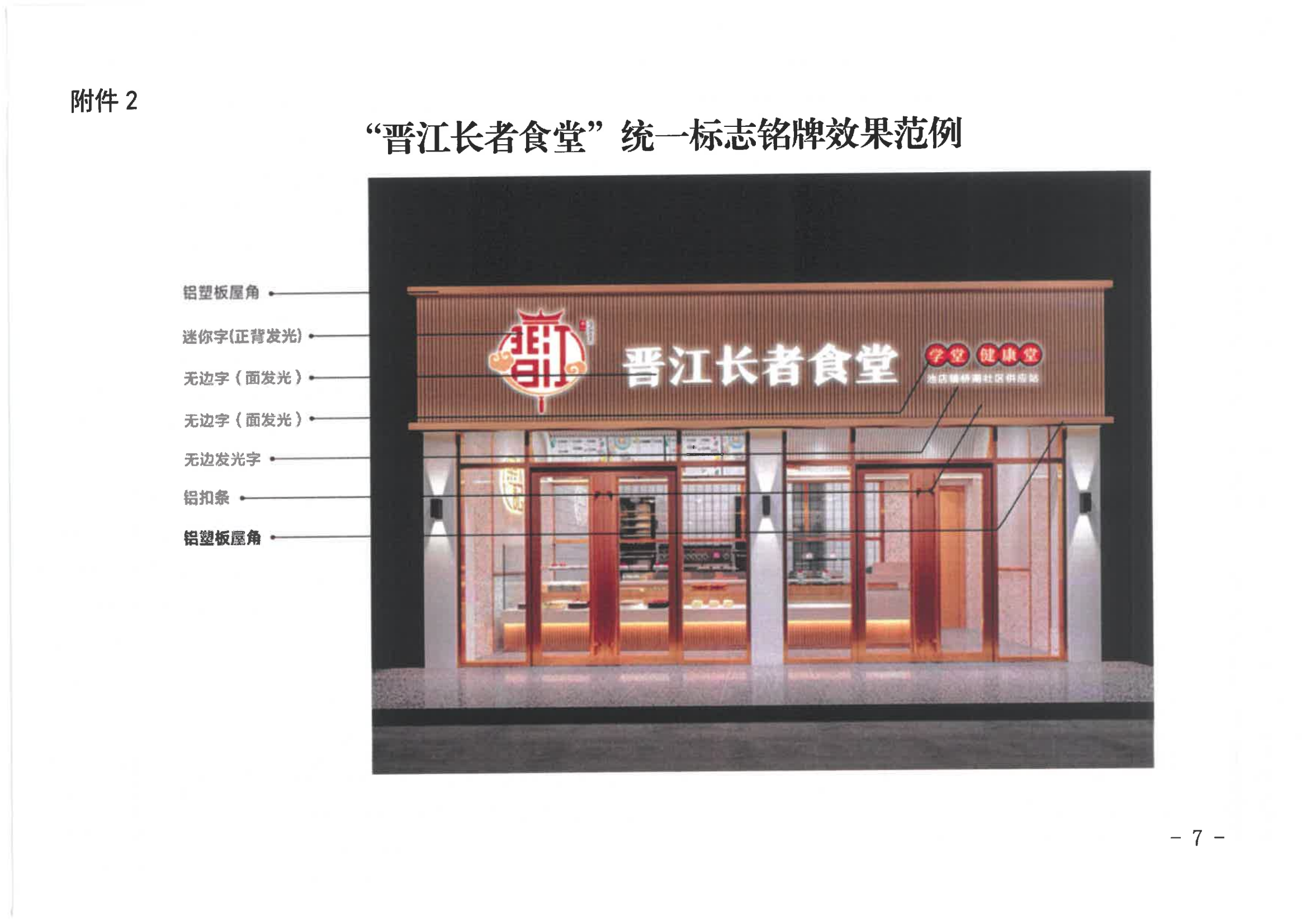 11.使用“晋江长者食堂”的统一标志铭牌,达到统一效果,各长者食堂的设计方案需提前报民政局养老服务科(附件2);