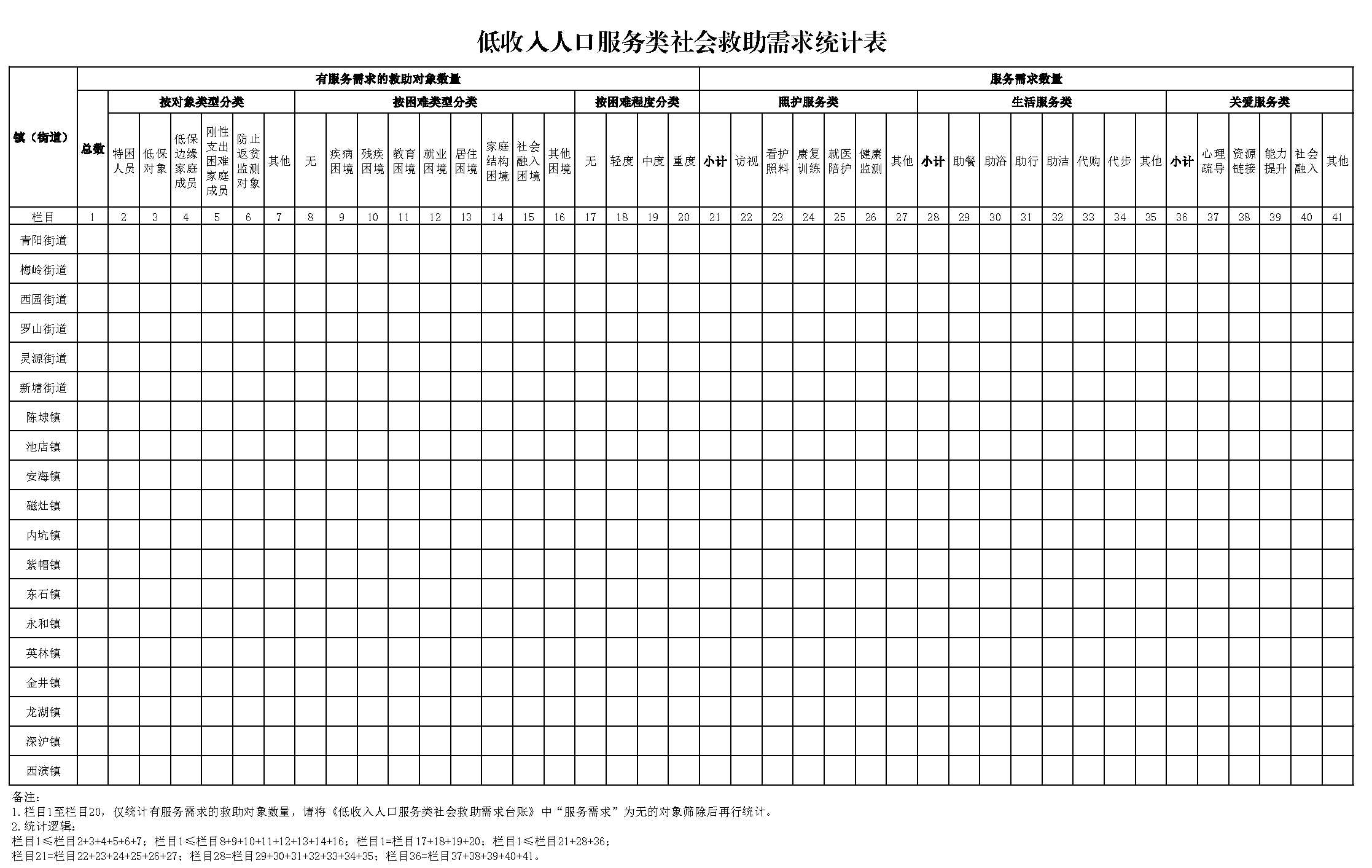 备注: 1.“对象类型”:包括“特困人员”、“低保对象”、“低保边缘家庭成员”、“刚性支出困难家庭成员”、“防止返贫监测对象”、“其他”。 2.“困难类型”:包括“无”、“疾病困境”、“残疾困境”、“教育困境”、“就业困境”、“居住困境”、“家庭结构困境”、“社会融入困境”、“其他困境”。填《低收入人口服务类社会救助需求评估表》中困难程度为轻度、中度、重度三个级别的困难类型,如果所有困难类型的困难程度均为无,则填“无”。 3.“困难程度”:根据《低收入人口服务类社会救助需求评估表》中各困难类型的困难程度级别就高确定,包括:“无”、“轻度”、“中度”、“重度”四个级别。 4.“服务需求”: (1)“照护服务类”:包括“无”、“访视”、“看护照料”、“康复训练”、“就医陪护”、“健康监测”、“其他”。 (2)“生活服务类”:包括“无”、“助餐”、“助浴”、“助行”、“助洁”、“代购”、“代步”、“其他”。 (3)“关爱服务类”:包括“无”、“心理疏导”、“资源链接”、“能力提升”、“社会融入”、“其他”。 5.“备注”:对象类型填“其他”的、困难类型填“其他困境”的、服务需求填“其他”的,需备注说明具体情况。 |