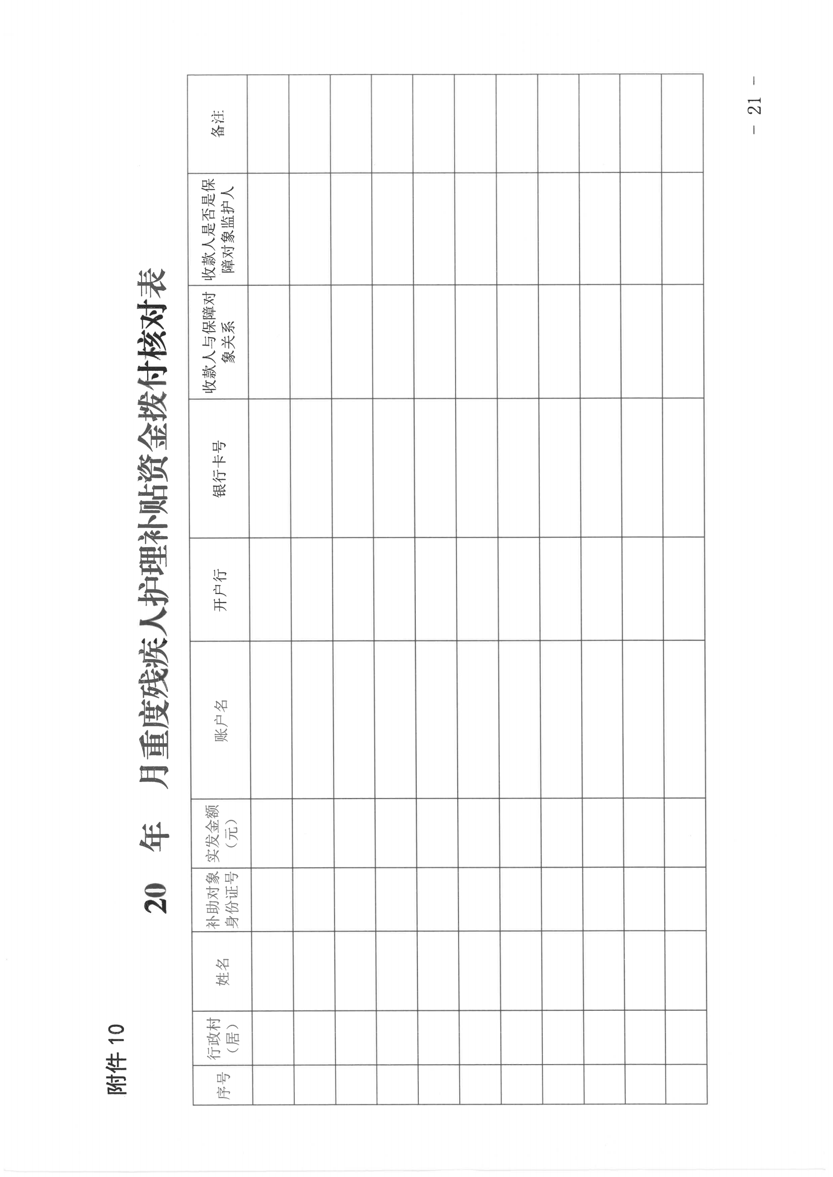 10.20 年月重度残疾人护理补贴资金拨付核对表