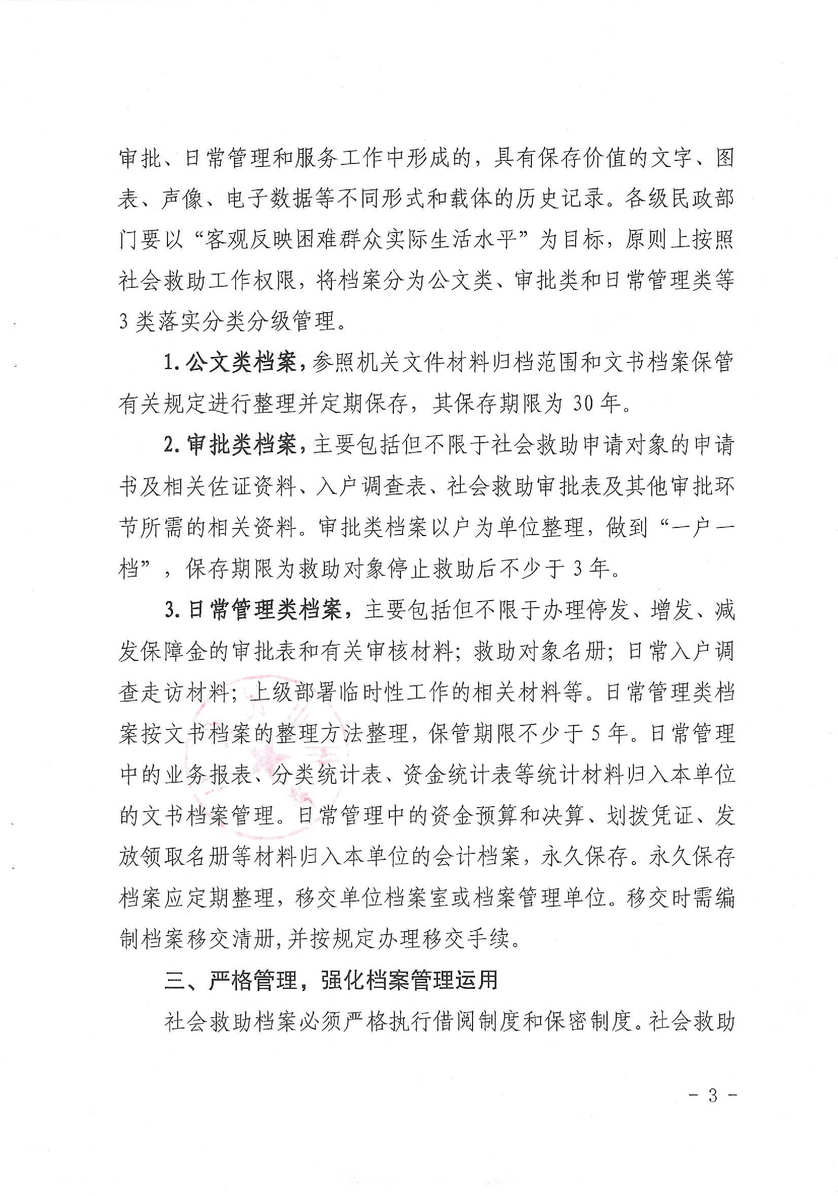 二、统一标准,规范管理。严格按照档案类型分类管理,对社会救助申请对象的审批材料,包括但不限于申请书及相关佐证资料、入户调查表、社会救助审批表及其他审批环节所需的相关资料,以户为单位进行整理,做到“一户一档”,保存期限为救助对象停止救助后不少于3年。公文类档案保存期限为30年;日常管理类档案保管期限不少于5年,日常管理中的资金预算和决算、划拨凭证、发放领取名册等材料归入本单位的会计档案,永久保存。严格执行借阅制度和保密制度,社会救助档案不对外开放,严禁擅自销毁社会救助档案。
