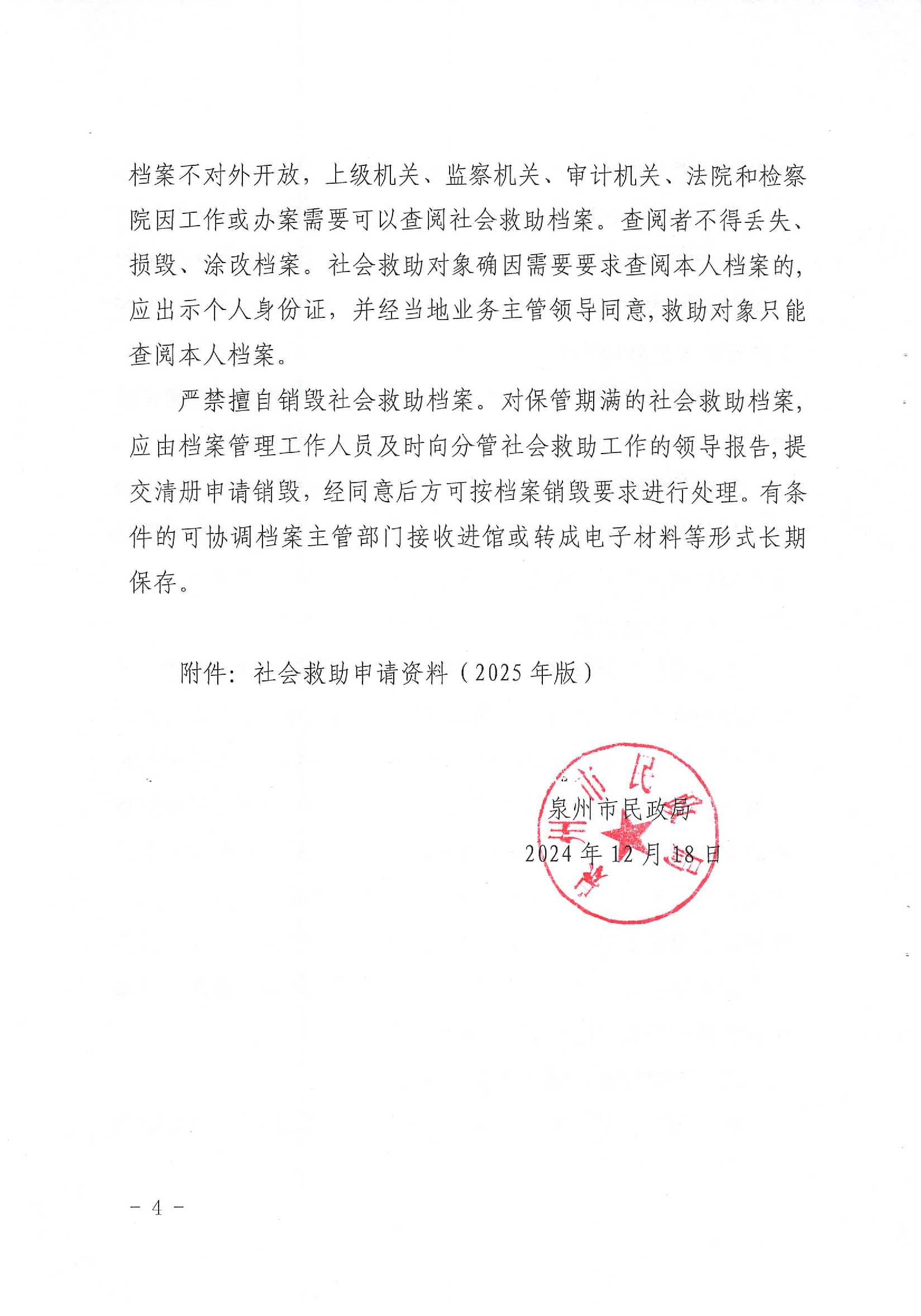 为深化社会救助领域群众身边不正之风和腐败问题集中整治,进一步强化社会救助档案管理,推动我市社会救助工作高质量发展,现将《泉州市民政局关于进一步规范社会救助档案管理的通知》(泉民保〔2023〕3号)转发给你们,请结合实际,认真抓好贯彻执行。