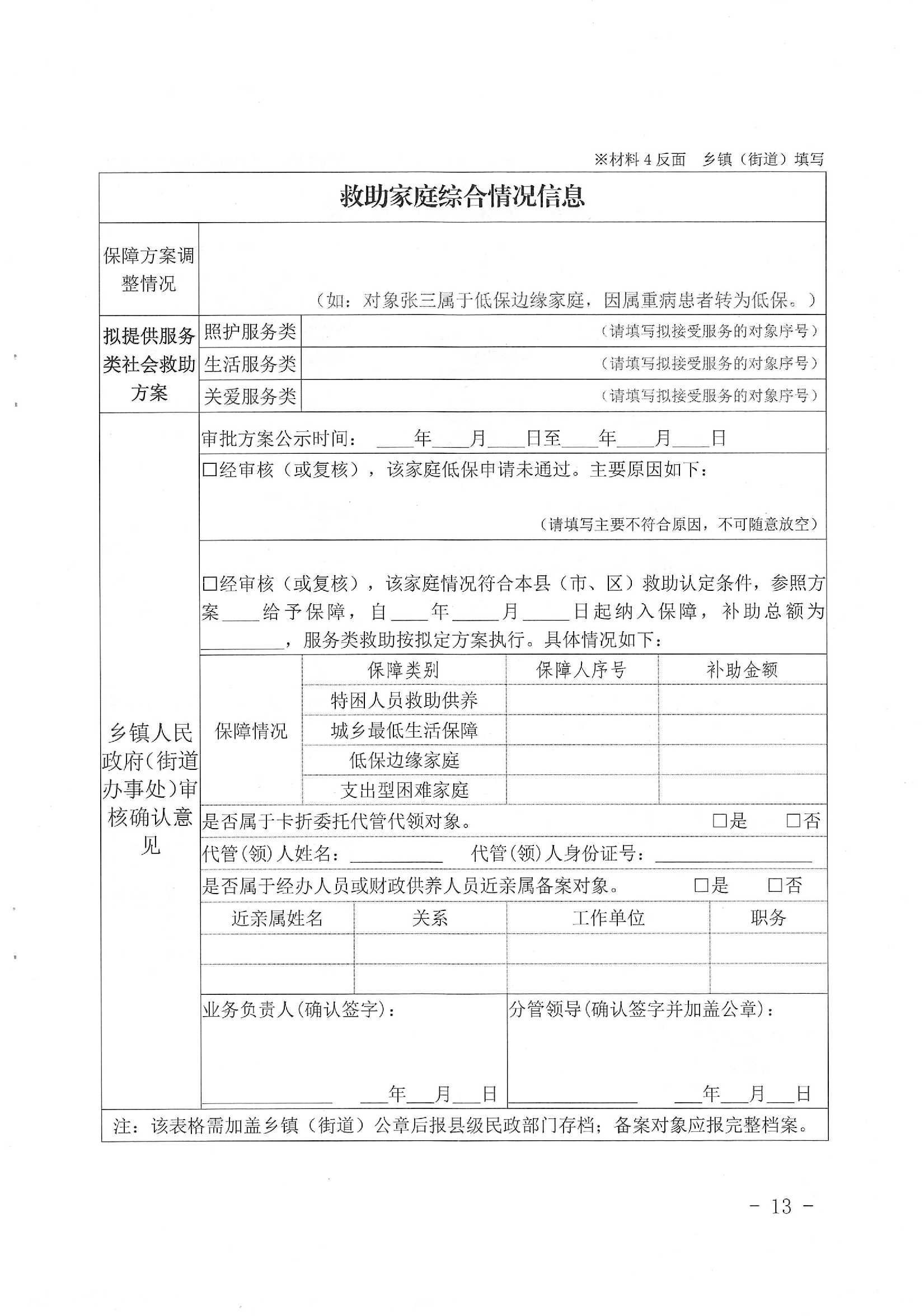 镇(街道)审核审批意见: 经评估确定,该特困人员生活自理能力为 (自理/半自理/不能自理); 护理需求为 (全自理/半护理/全护理); 供养形式为 供养(集中/分散),供养所在机构 。 经办人签字: 审核人签字: 分管领导签字: 单位(盖章) 年 月 日 |