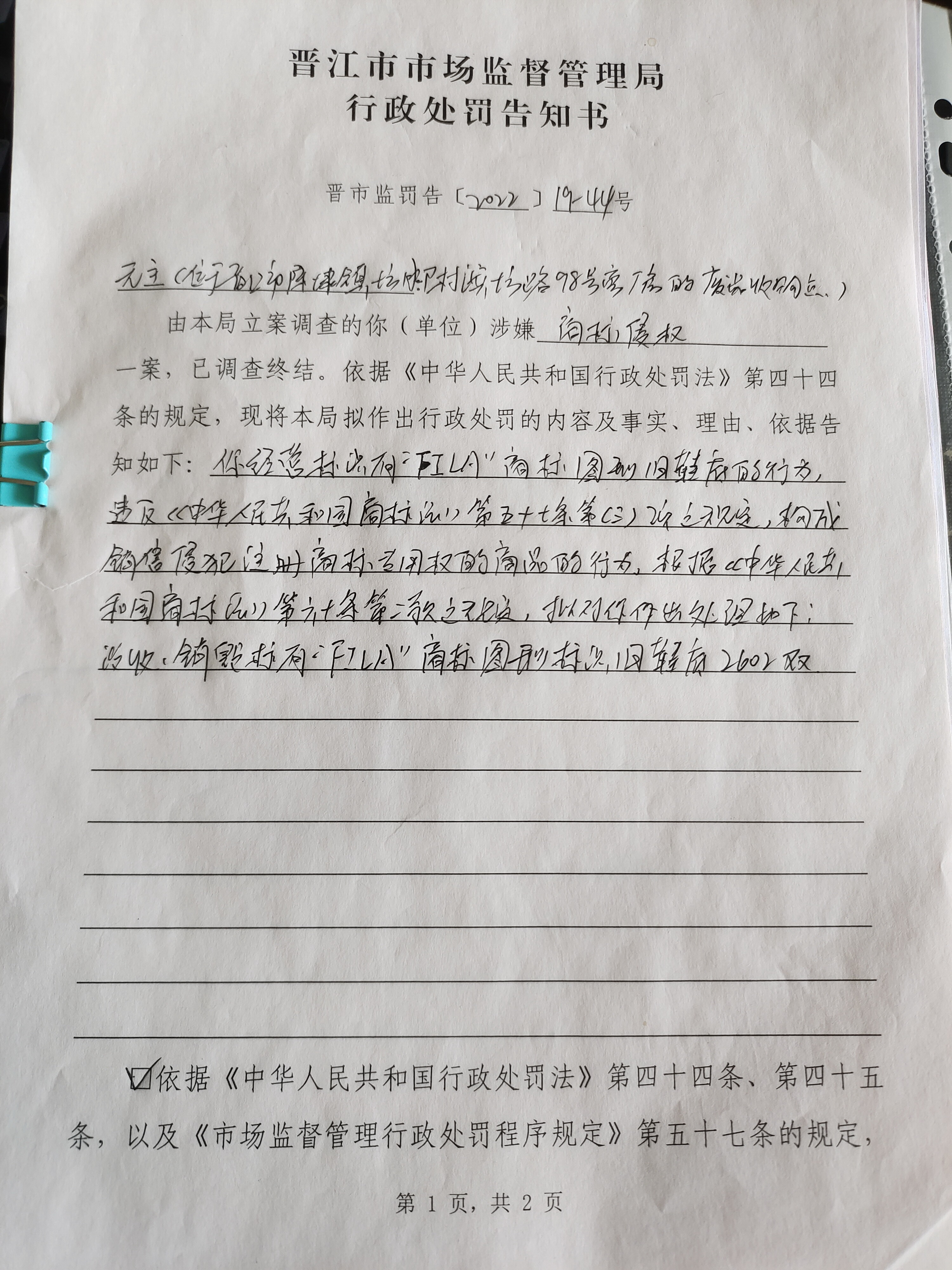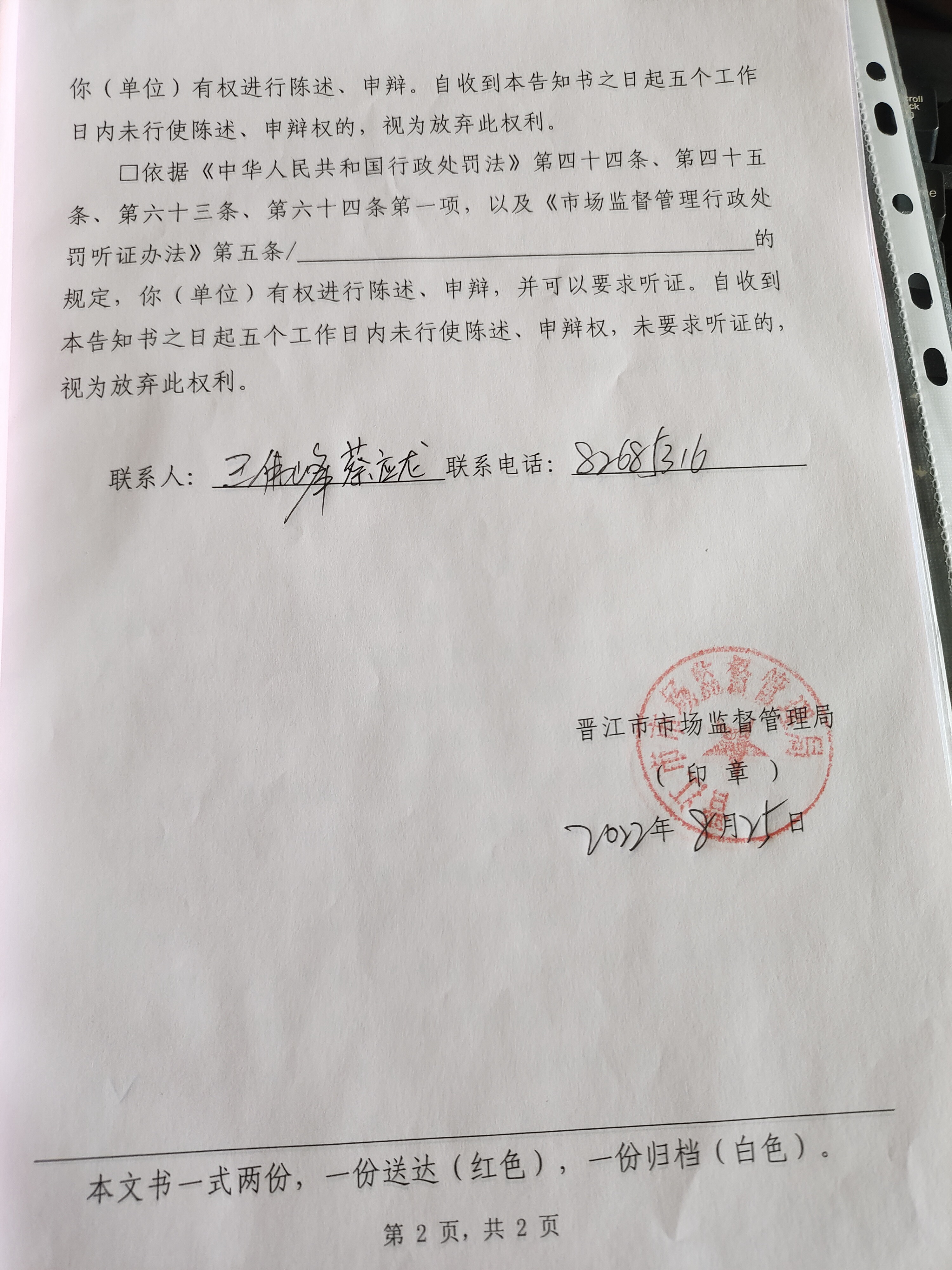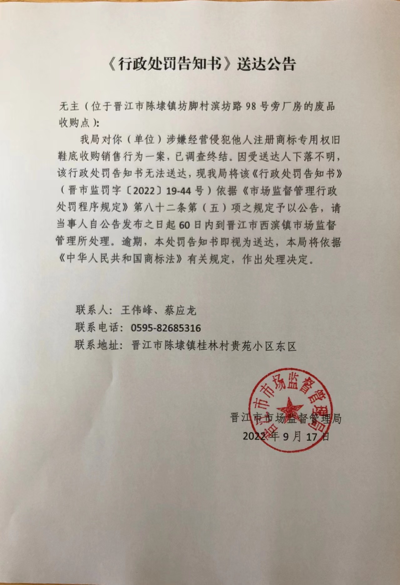 晋江市市场监督管理局行政处罚告知书送达公告(晋市监罚字〔2022〕19-44号)