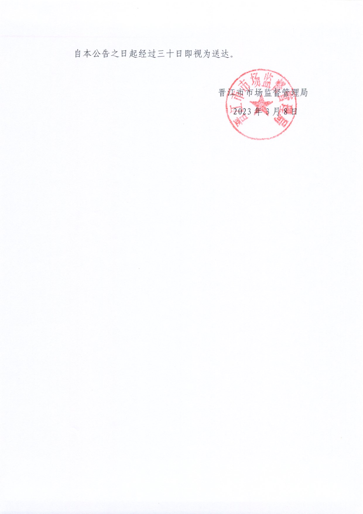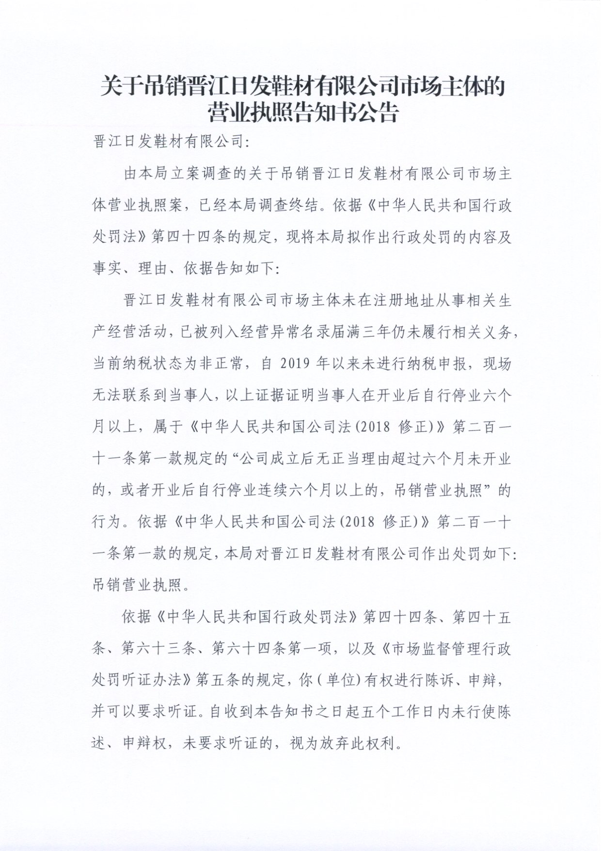 关于吊销晋江日发鞋材有限公司市场主体的营业执照告知书公告