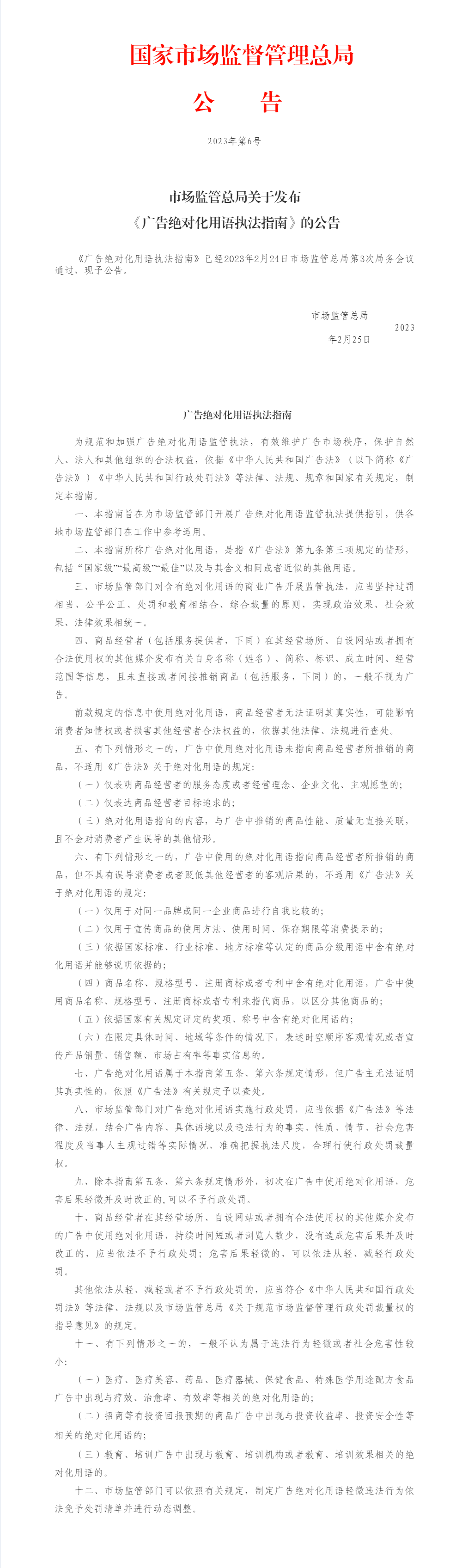 市场监管总局关于发布 《广告绝对化用语执法指南》的公告