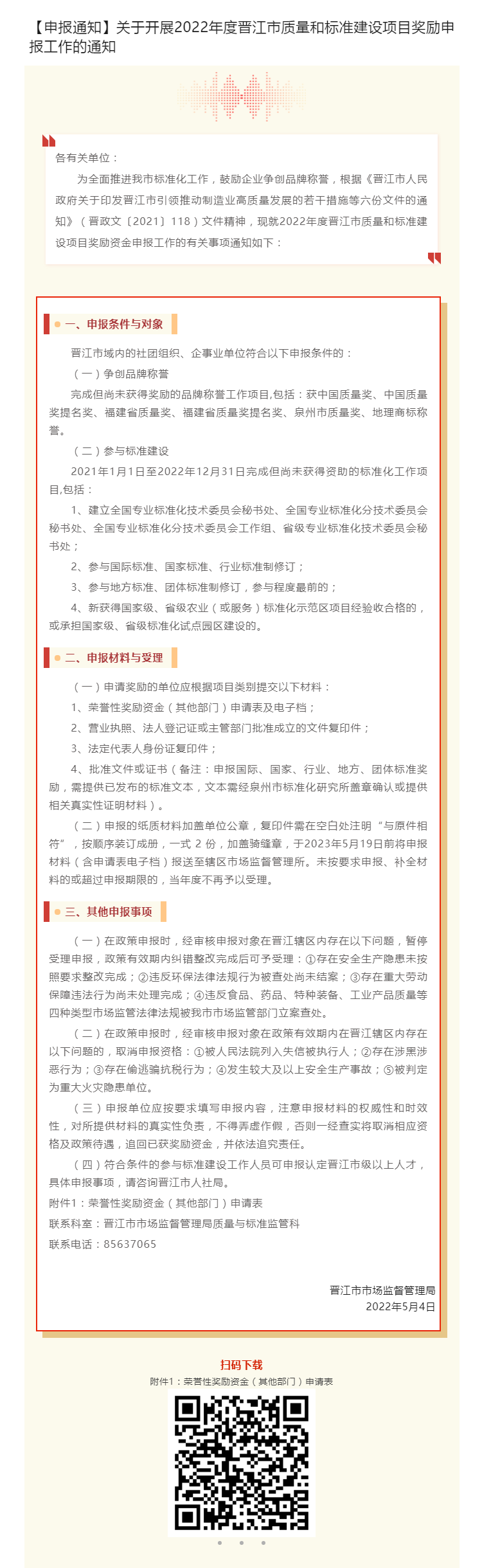 晋江市市场监督管理局关于开展2022年度晋江市质量和标准建设项目奖励申报工作的通知
