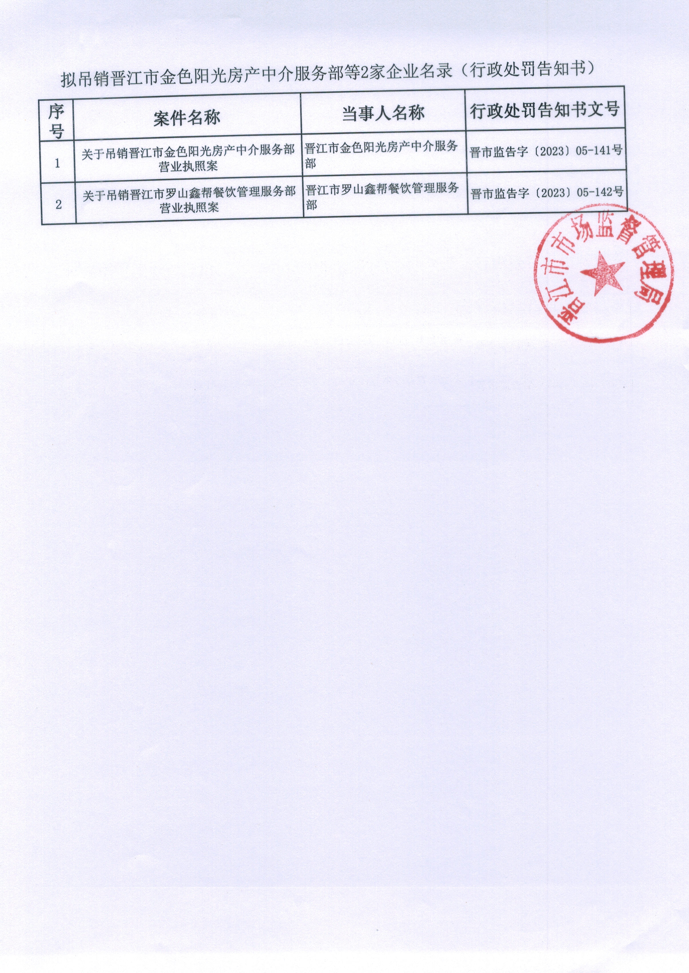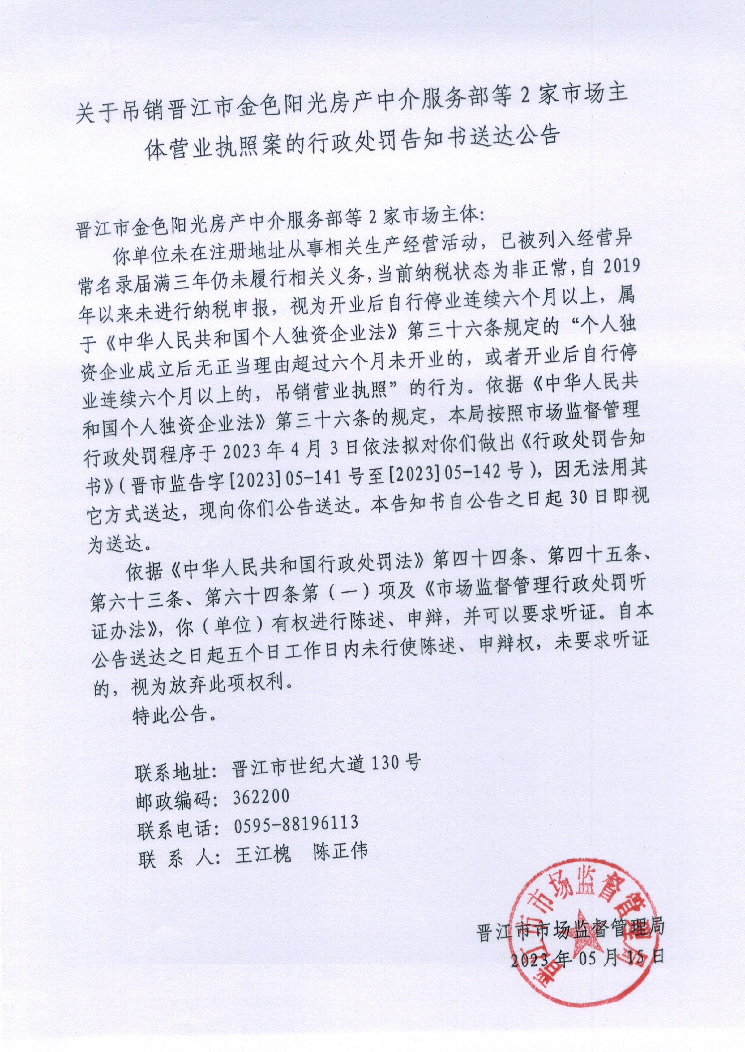 晋江市市场监督管理局关于晋江市金色阳光房产中介服务部等2家市场主体营业执照案的行政处罚告知书送达公告