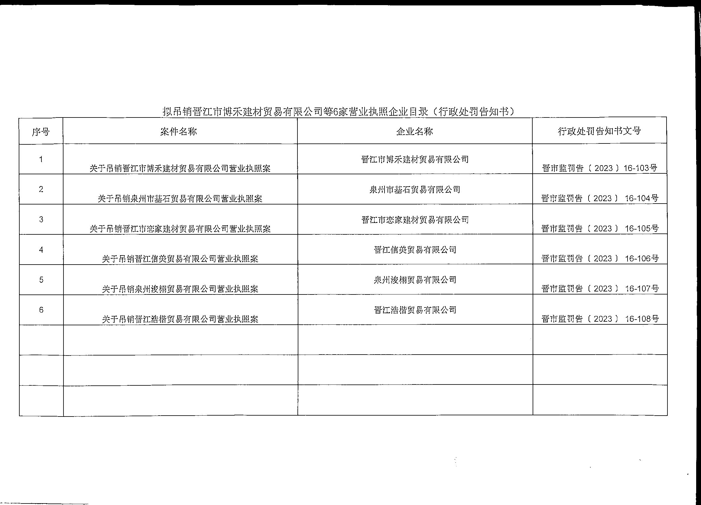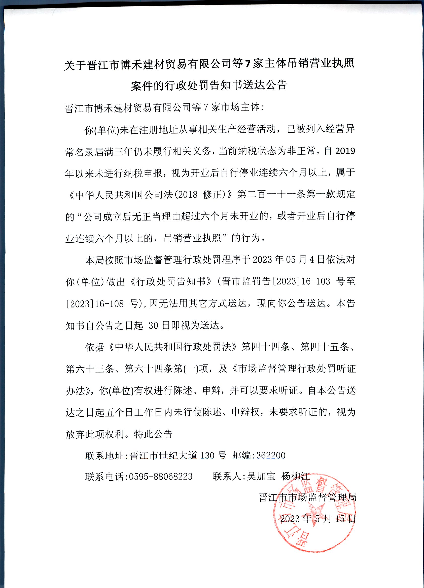 晋江市市场监督管理局关于晋江市博禾建材贸易有限公司等7家主体吊销营业执照案件的行政处罚告知书送达公告