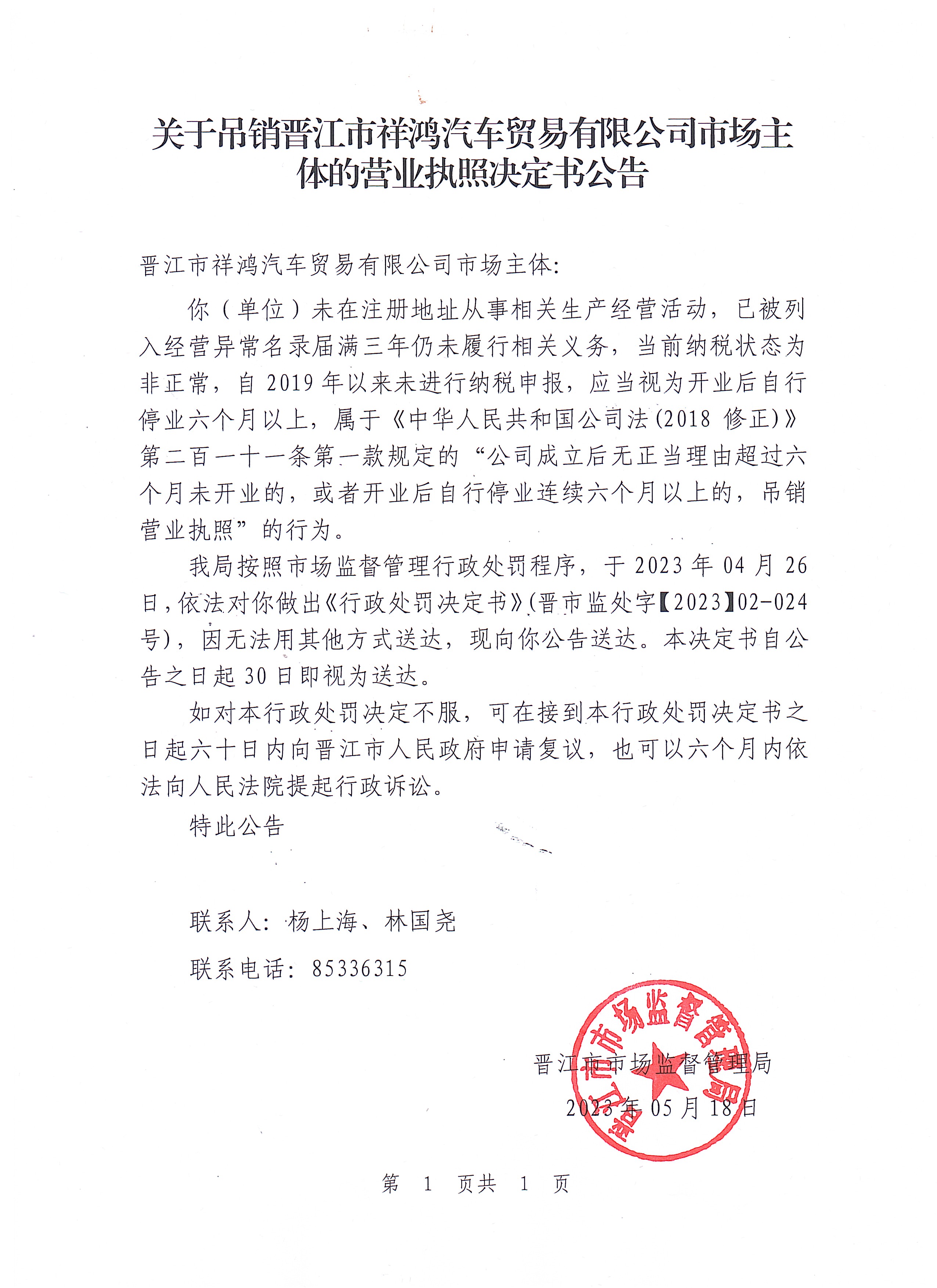 晋江市市场监督管理局关于吊销晋江市祥鸿汽车贸易有限公司市场主体的营业执照决定书公告