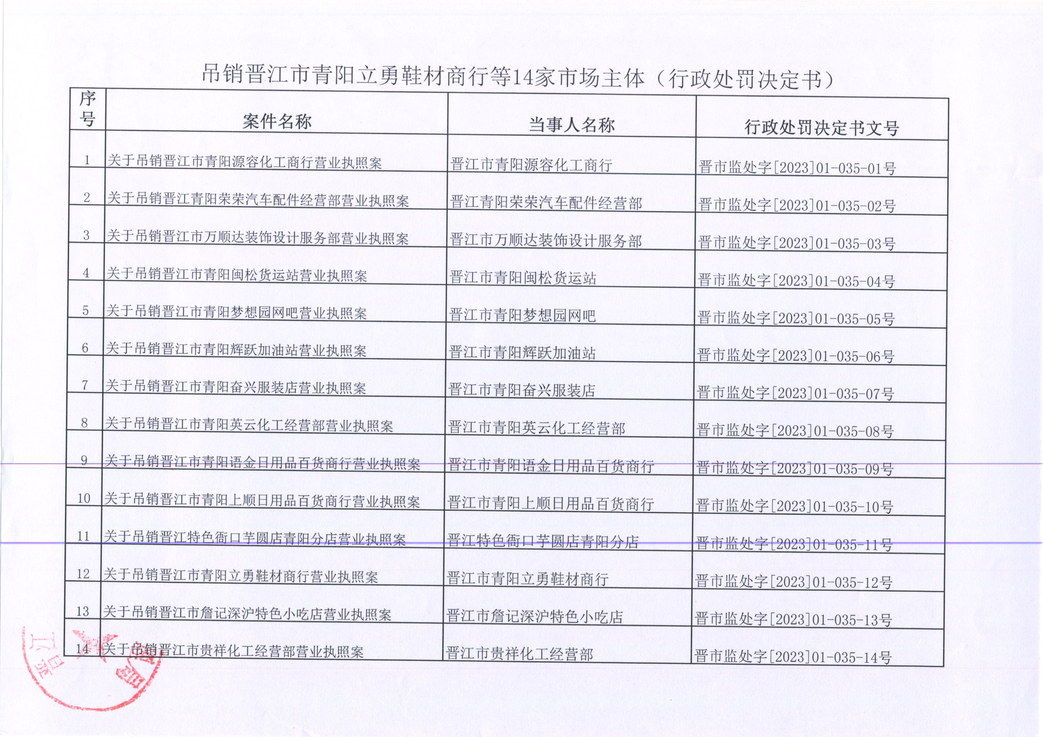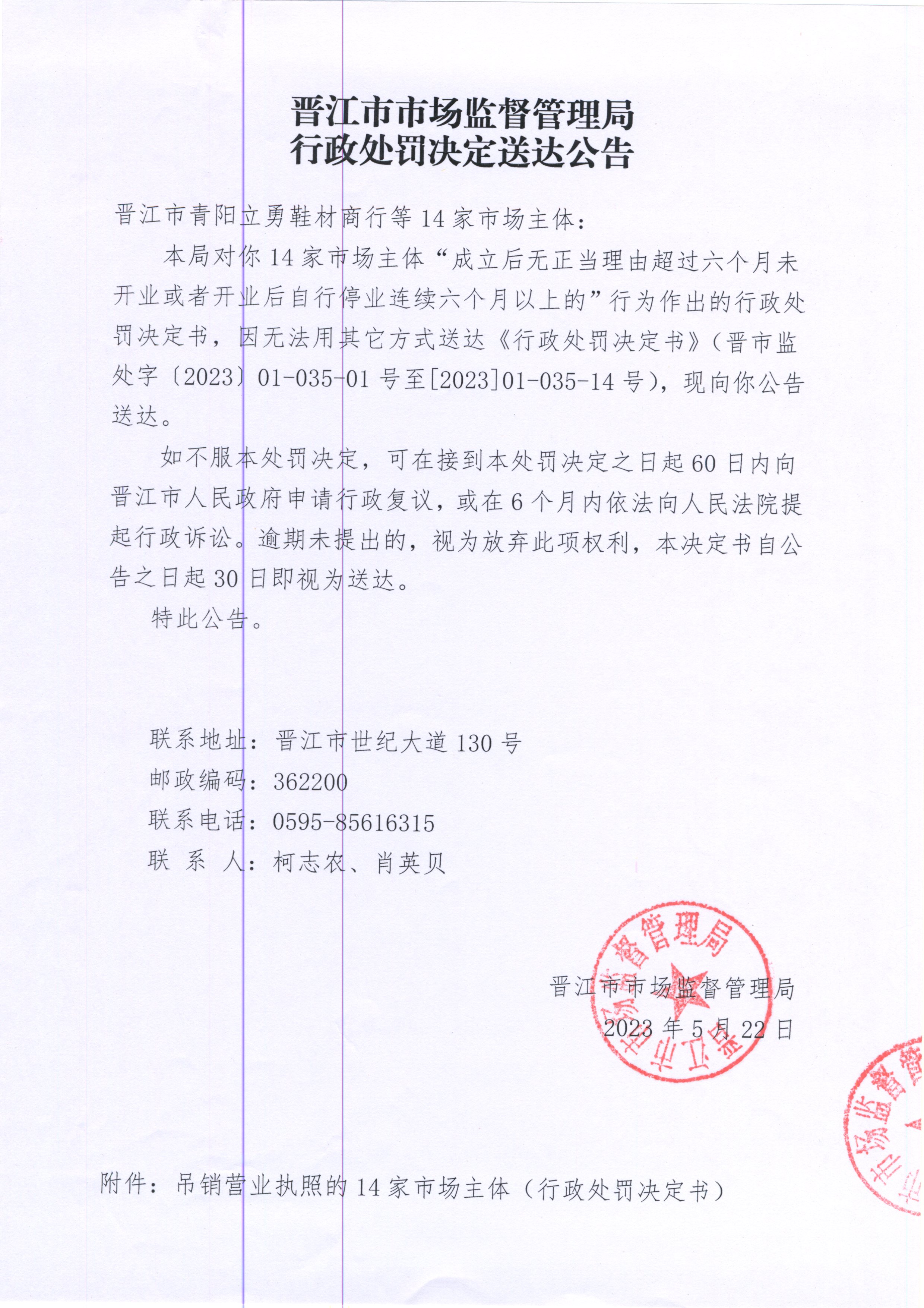 晋江市市场监督管理局晋江市市场监督管理局处罚决定书送达公告(晋江市青阳立勇鞋材商行等14家)