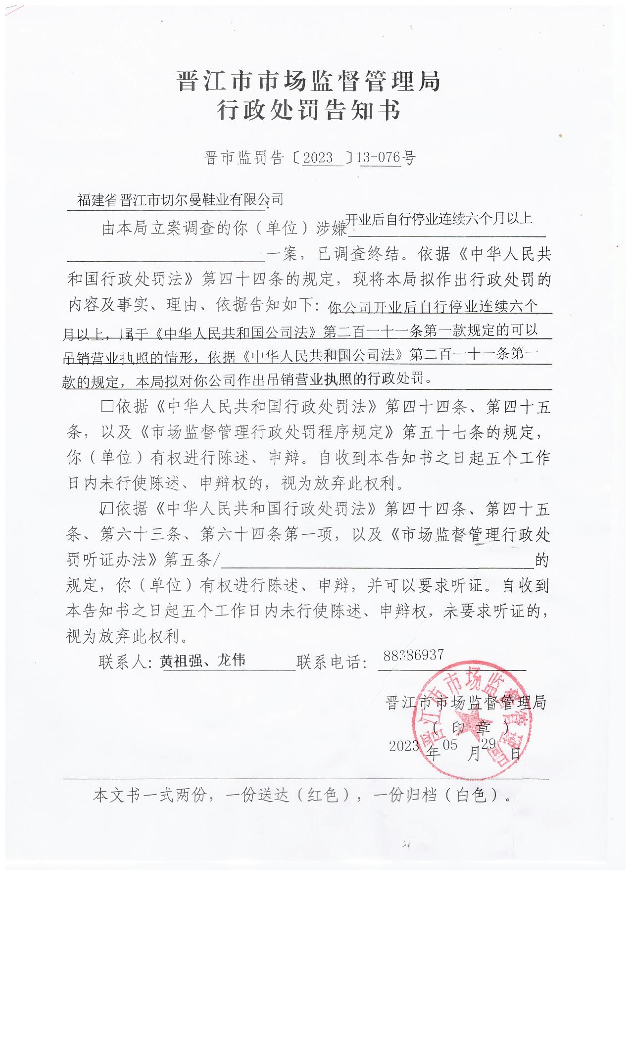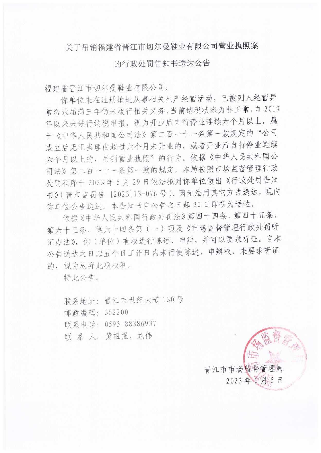 晋江市市场监督管理局关于吊销福建省晋江市切尔曼鞋业有限公司营业执照案的行政处罚告知书送达公告