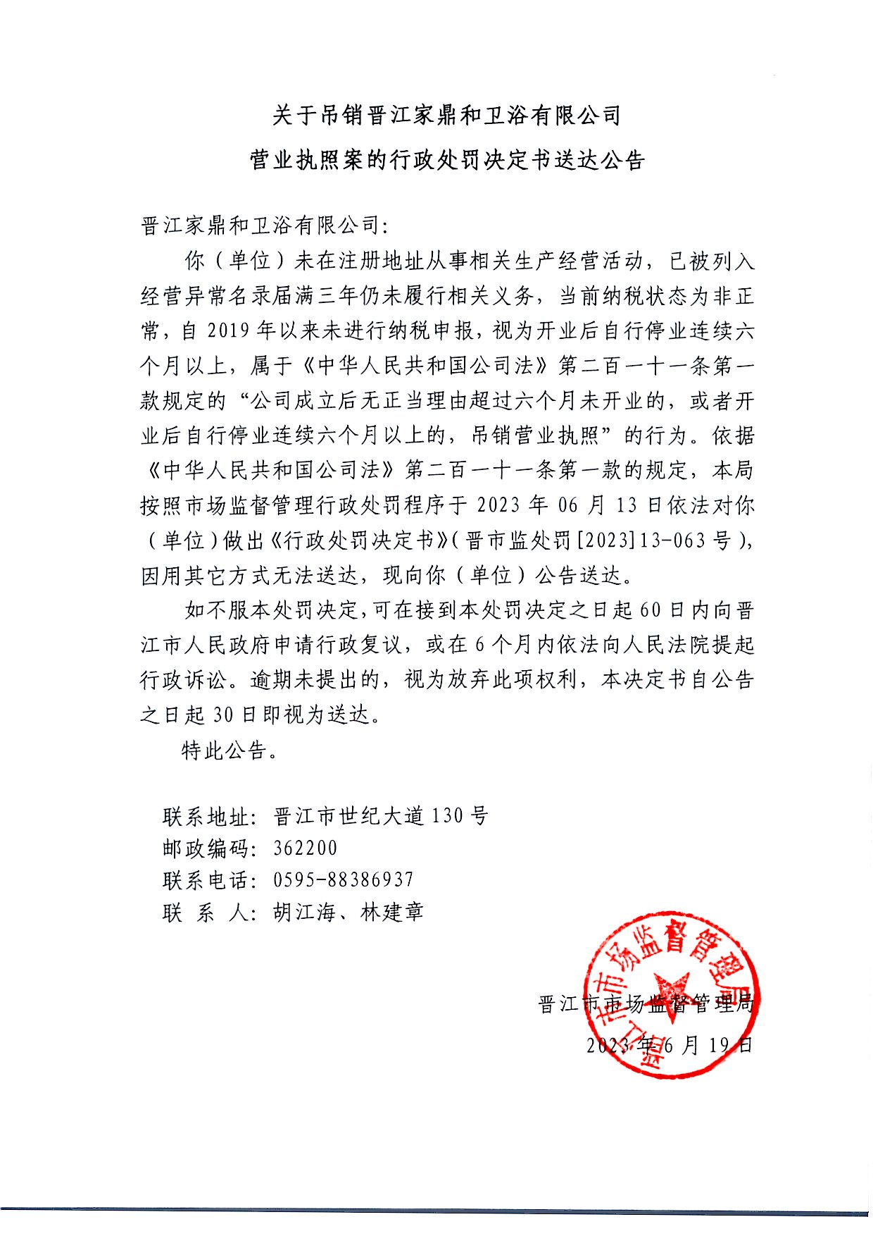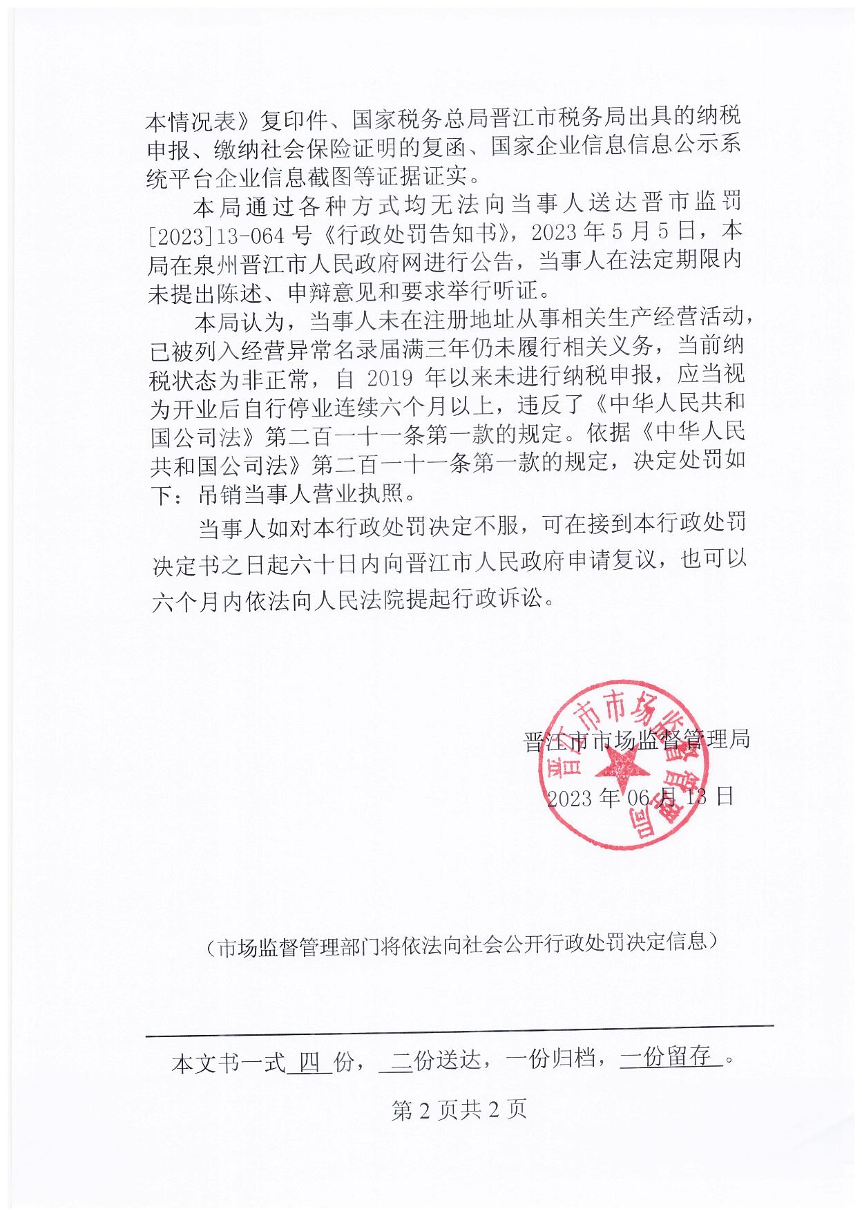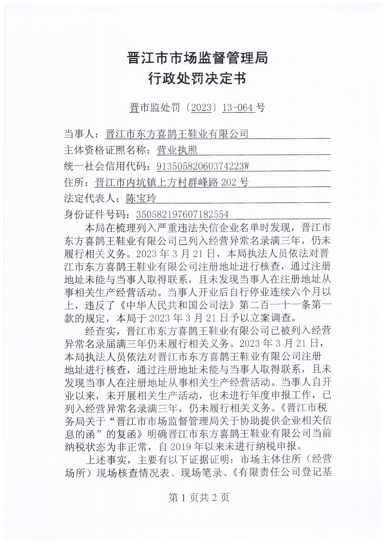 晋江市市场监督管理局关于吊销晋江市东方喜鹊王鞋业有限公司营业执照案的行政处罚决定书送达公告