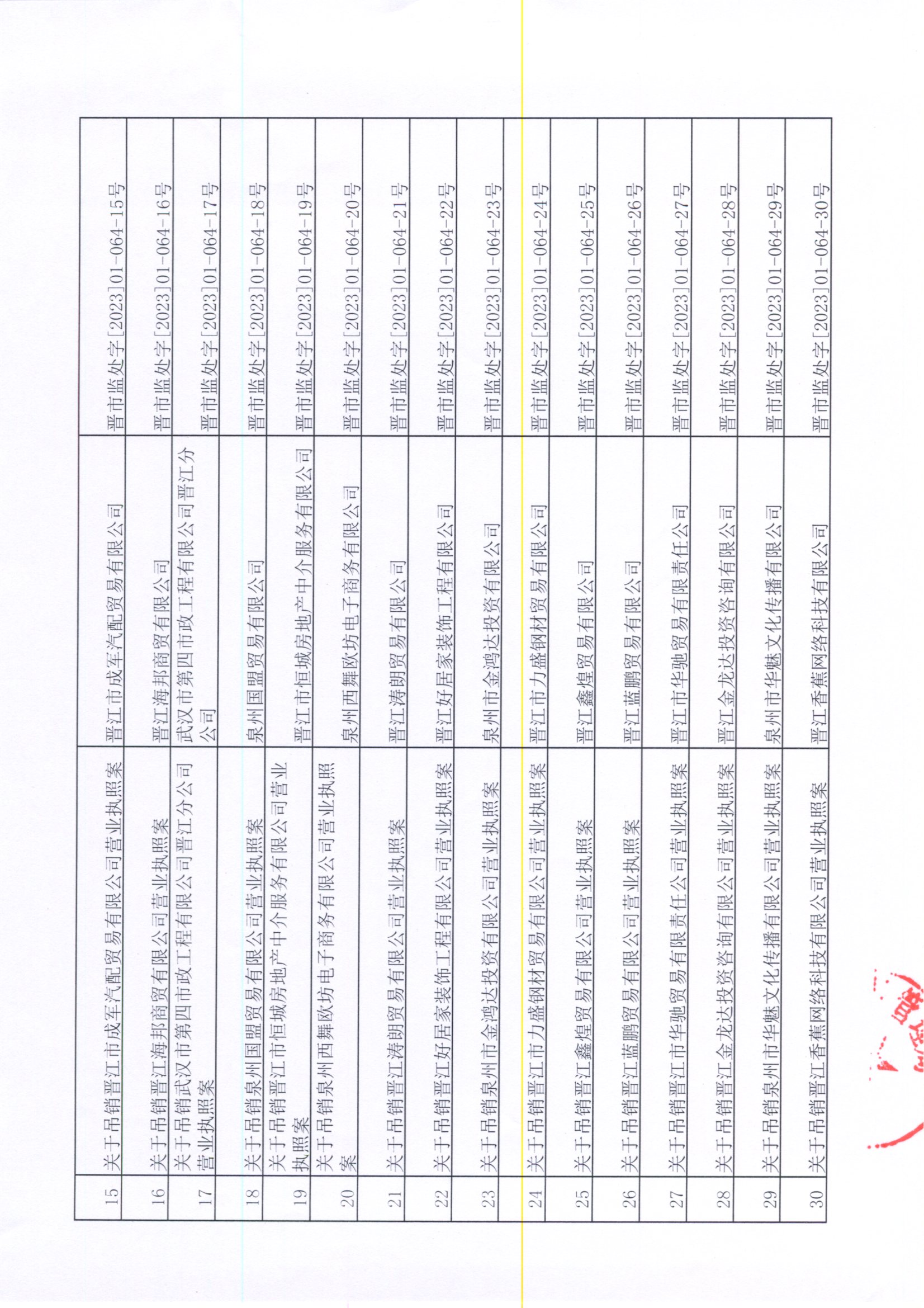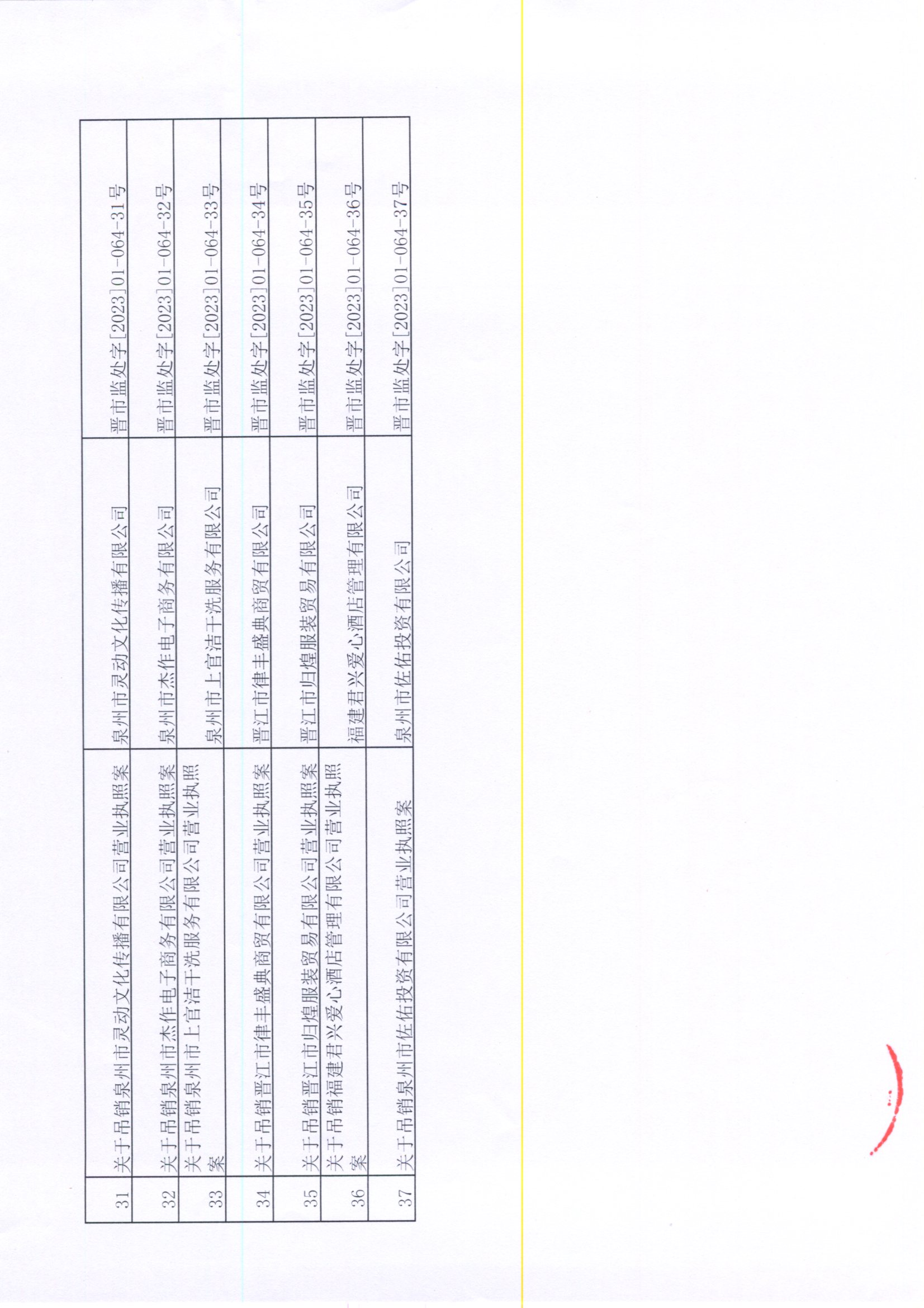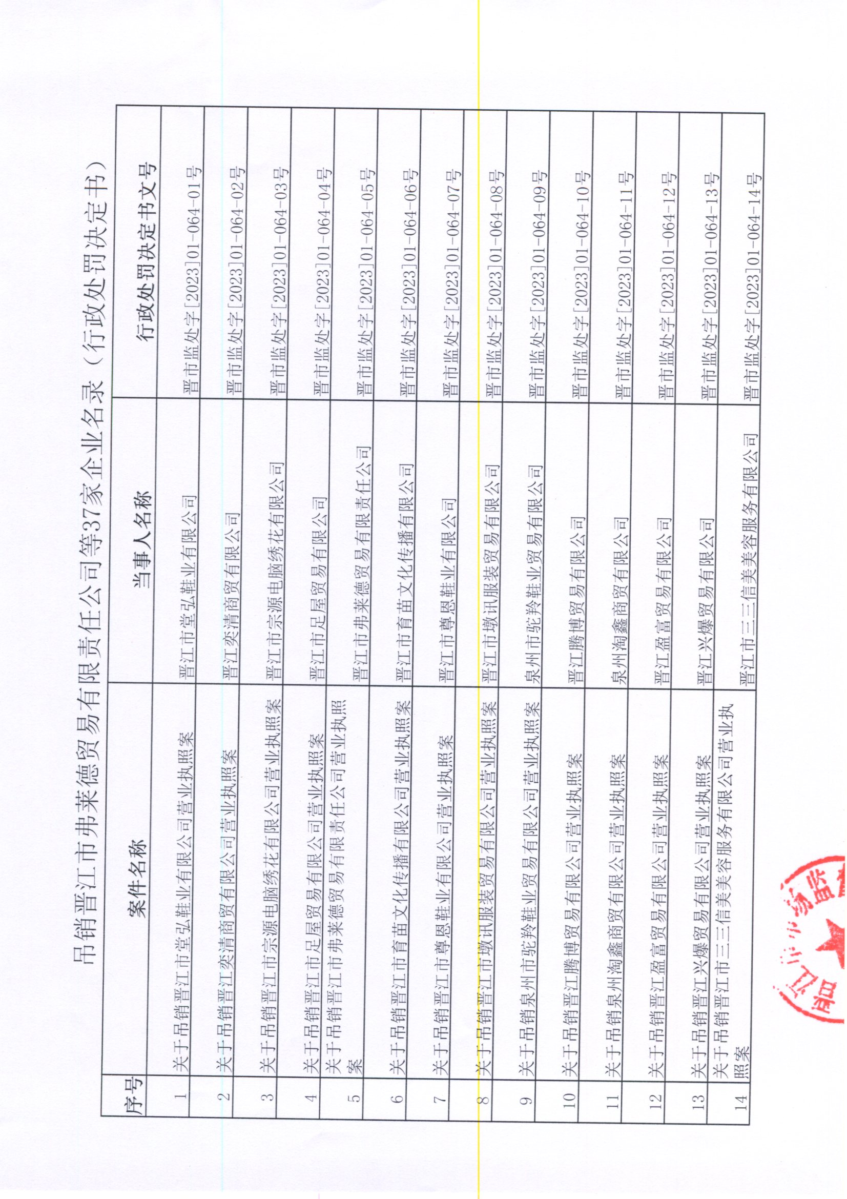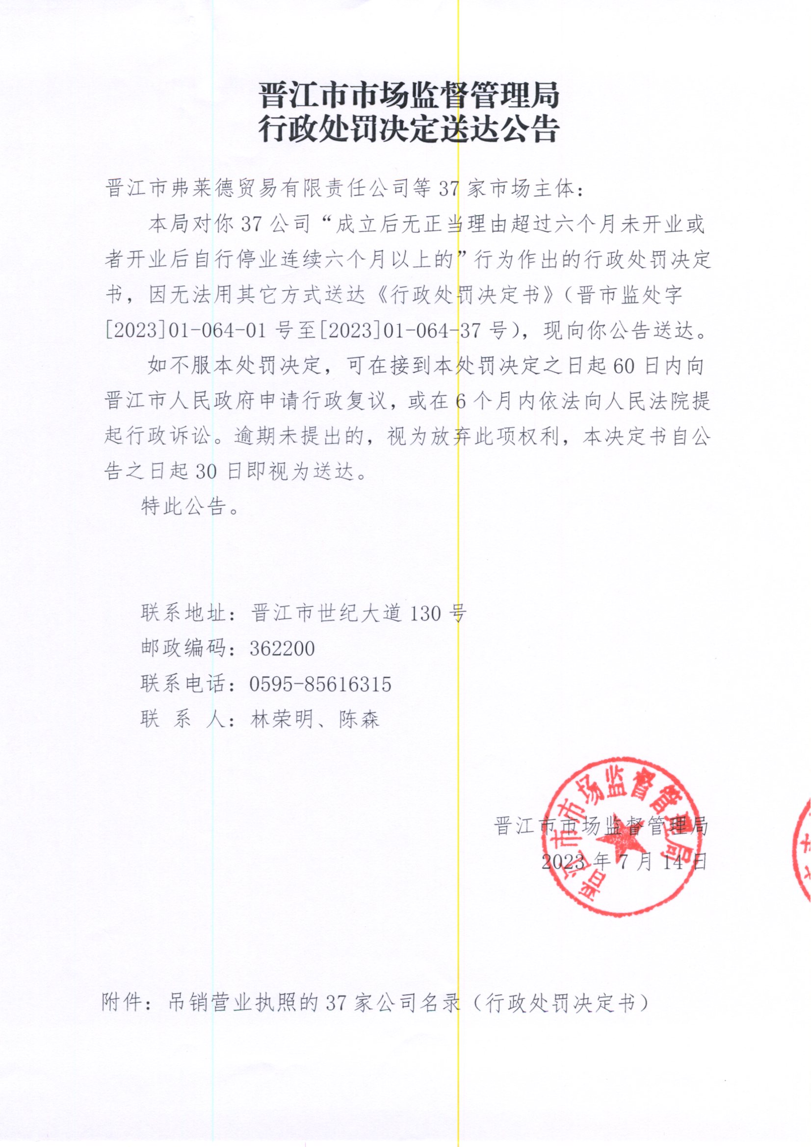 晋江市市场监督管理局行政处罚决定送达公告(晋江市弗莱德贸易有限责任公司等37家)
