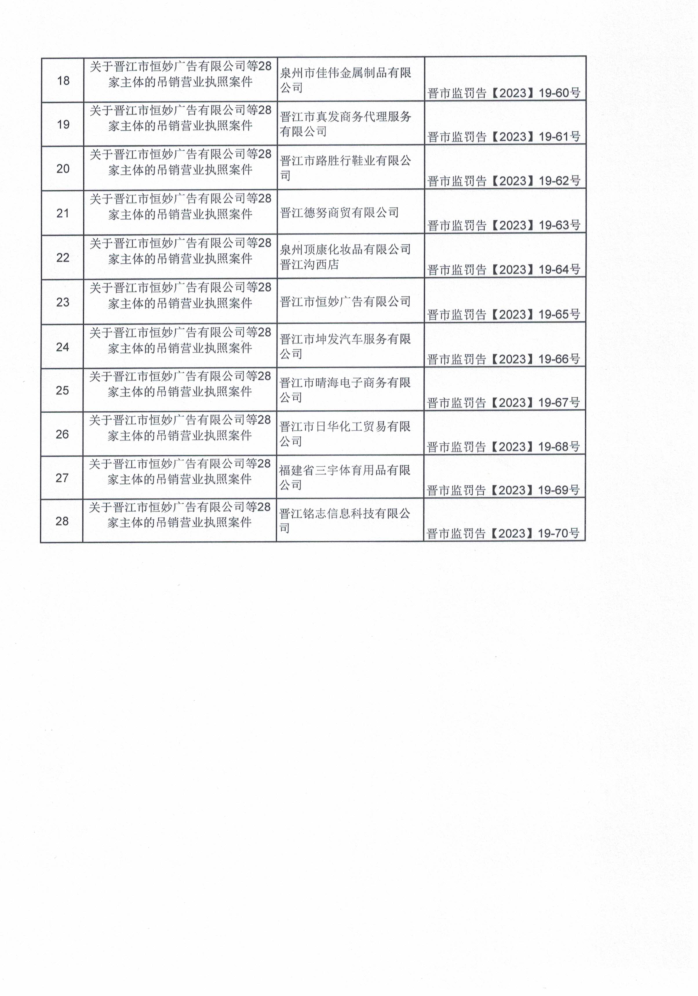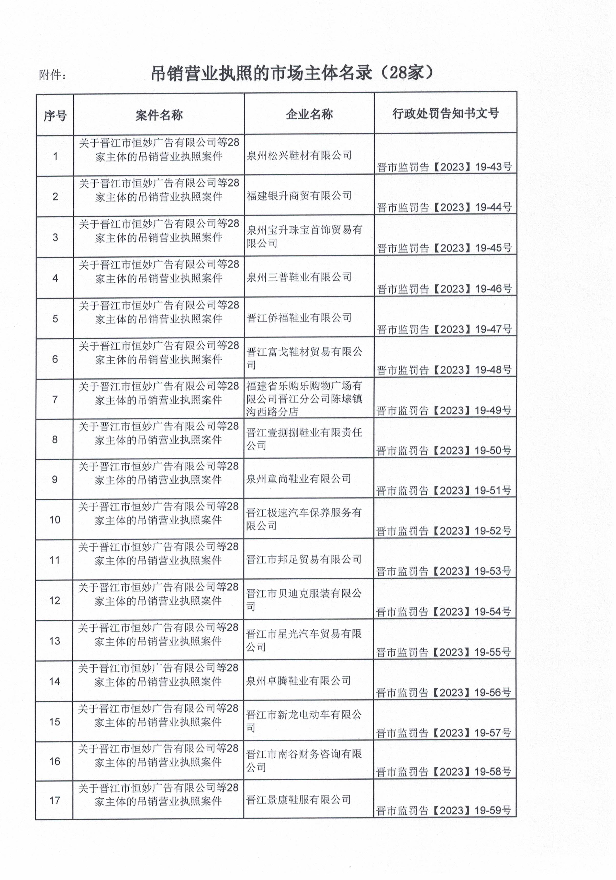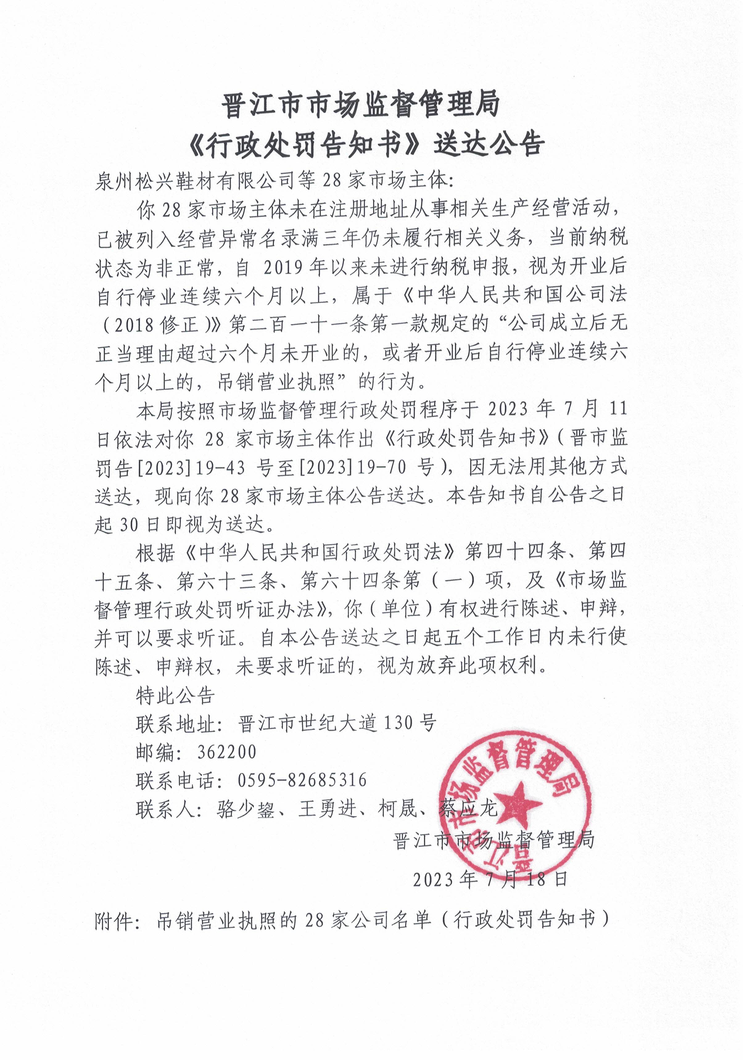 晋江市市场监督管理局行政处罚告知书送达公告(泉州松兴鞋材有限公司等28家)