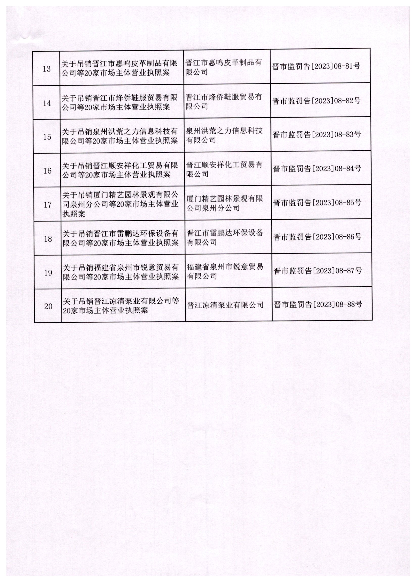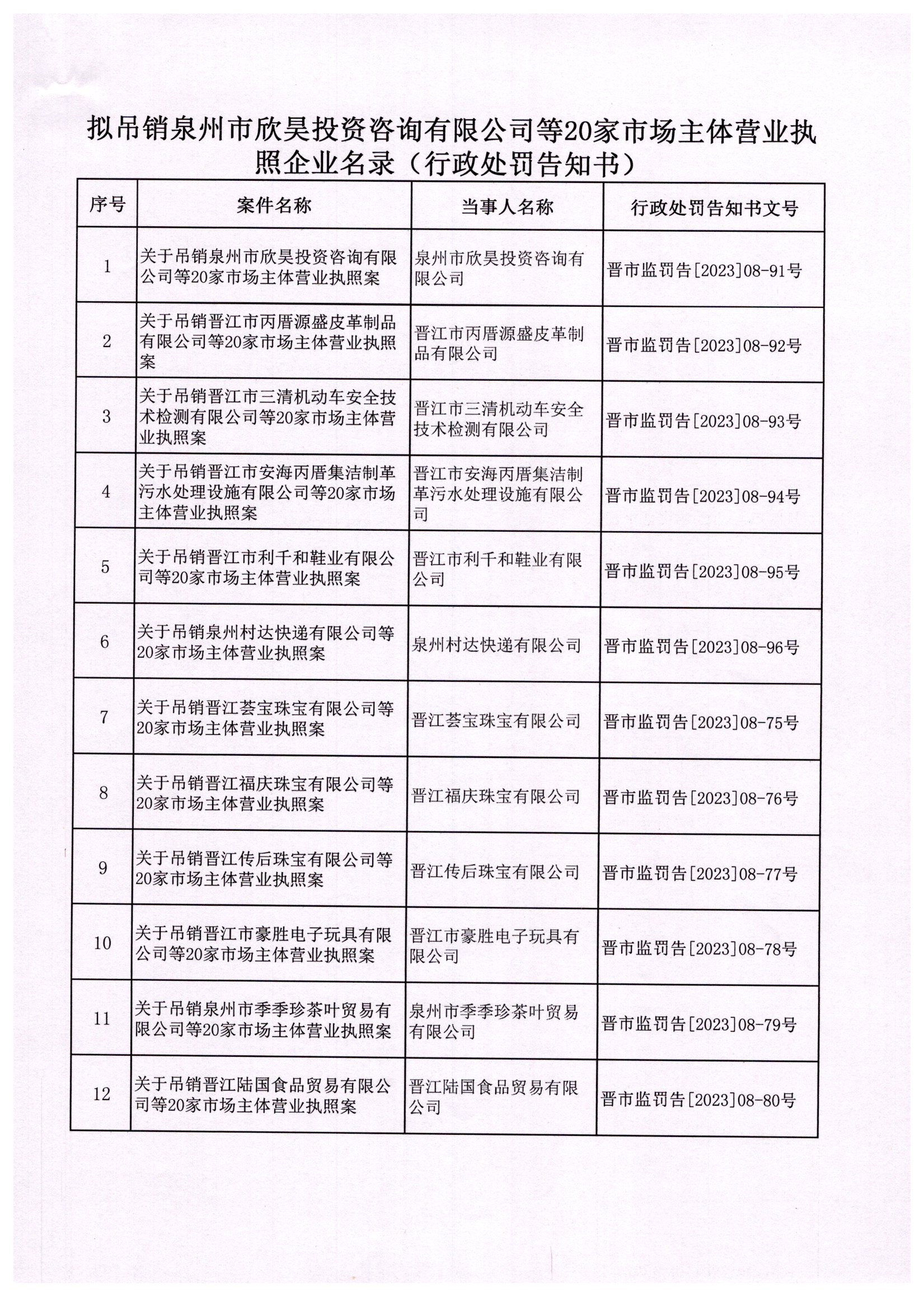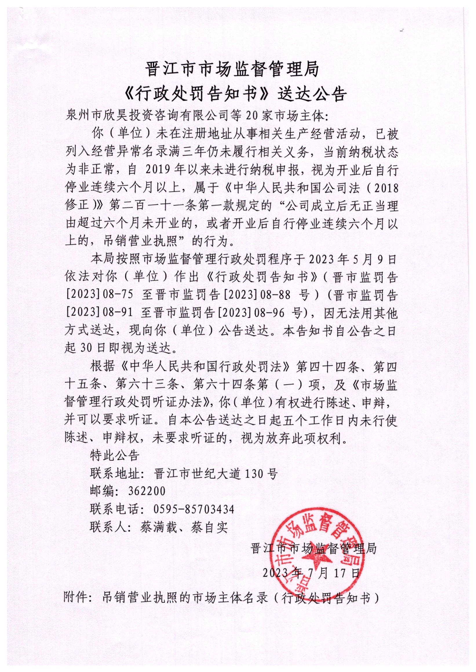 晋江市市场监督管理局行政处罚告知书送达公告(泉州市欣昊投资咨询有限公司等20家市场主体)