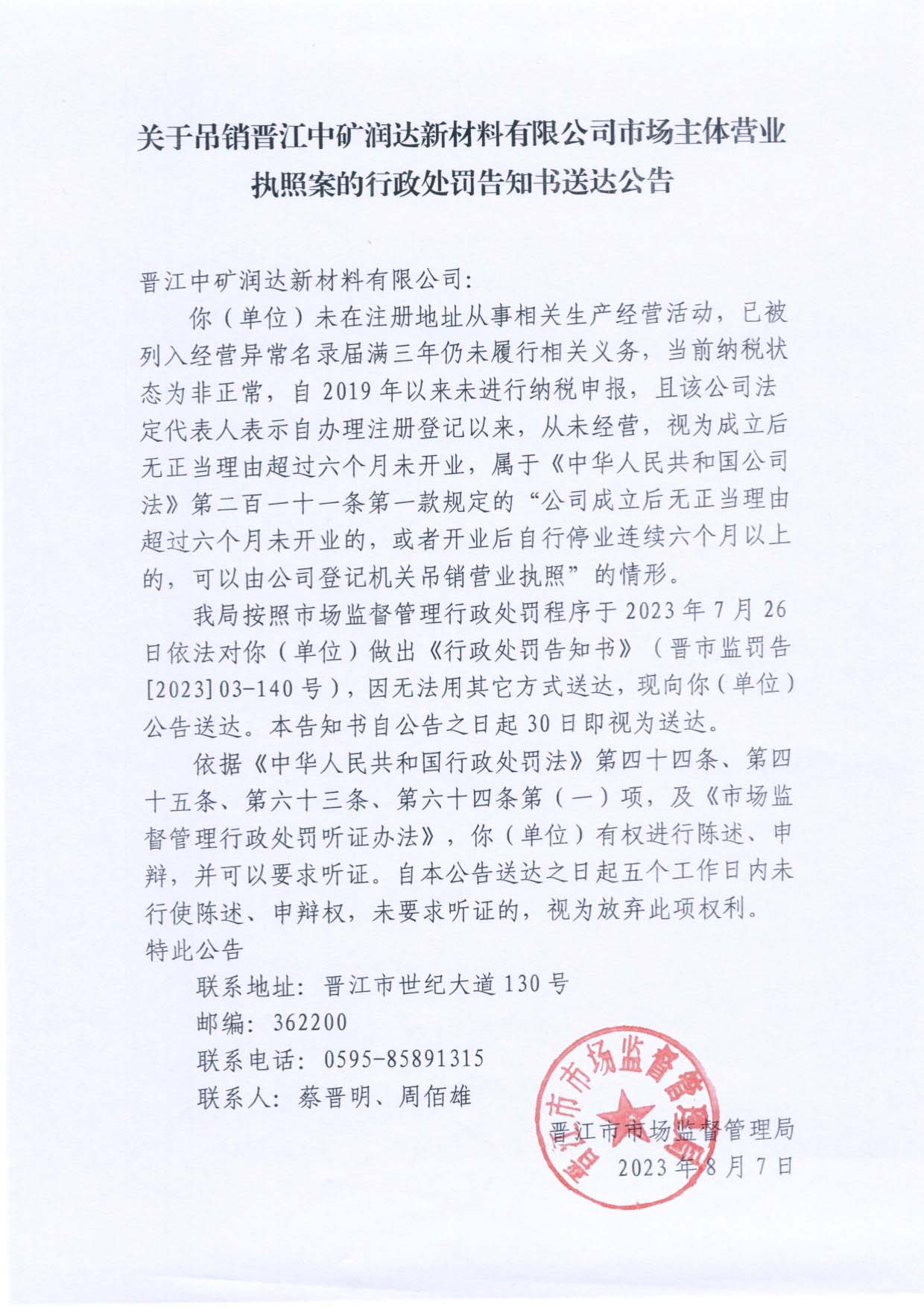 晋江市市场监督管理局关于吊销晋江中矿润达新材料有限公司市场主体营业执照案的行政处罚告知书送达公告