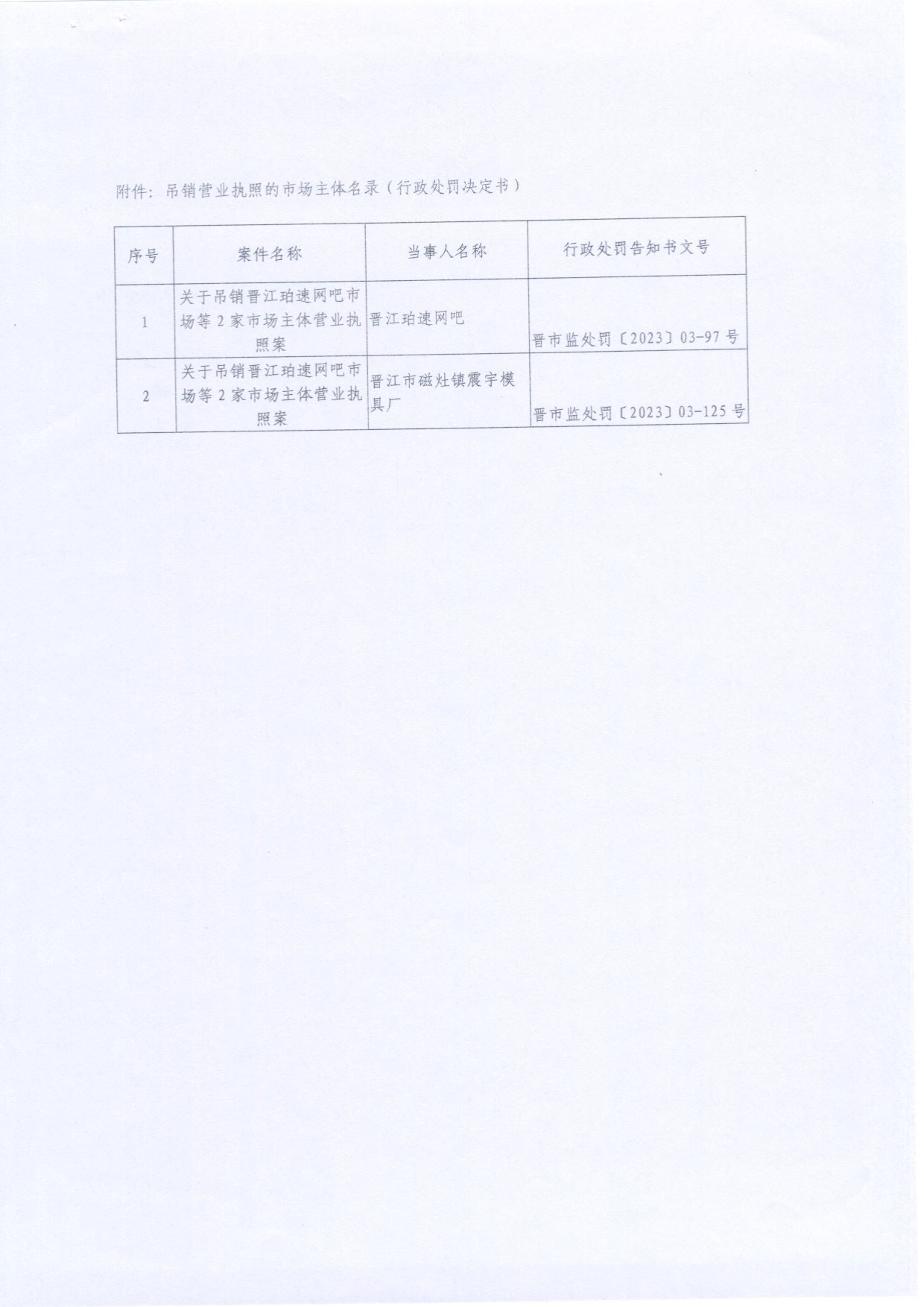 晋江市市场监督管理局关于吊销晋江珀速网吧等2家市场主体营业执照案的行政处罚决定书送达公告